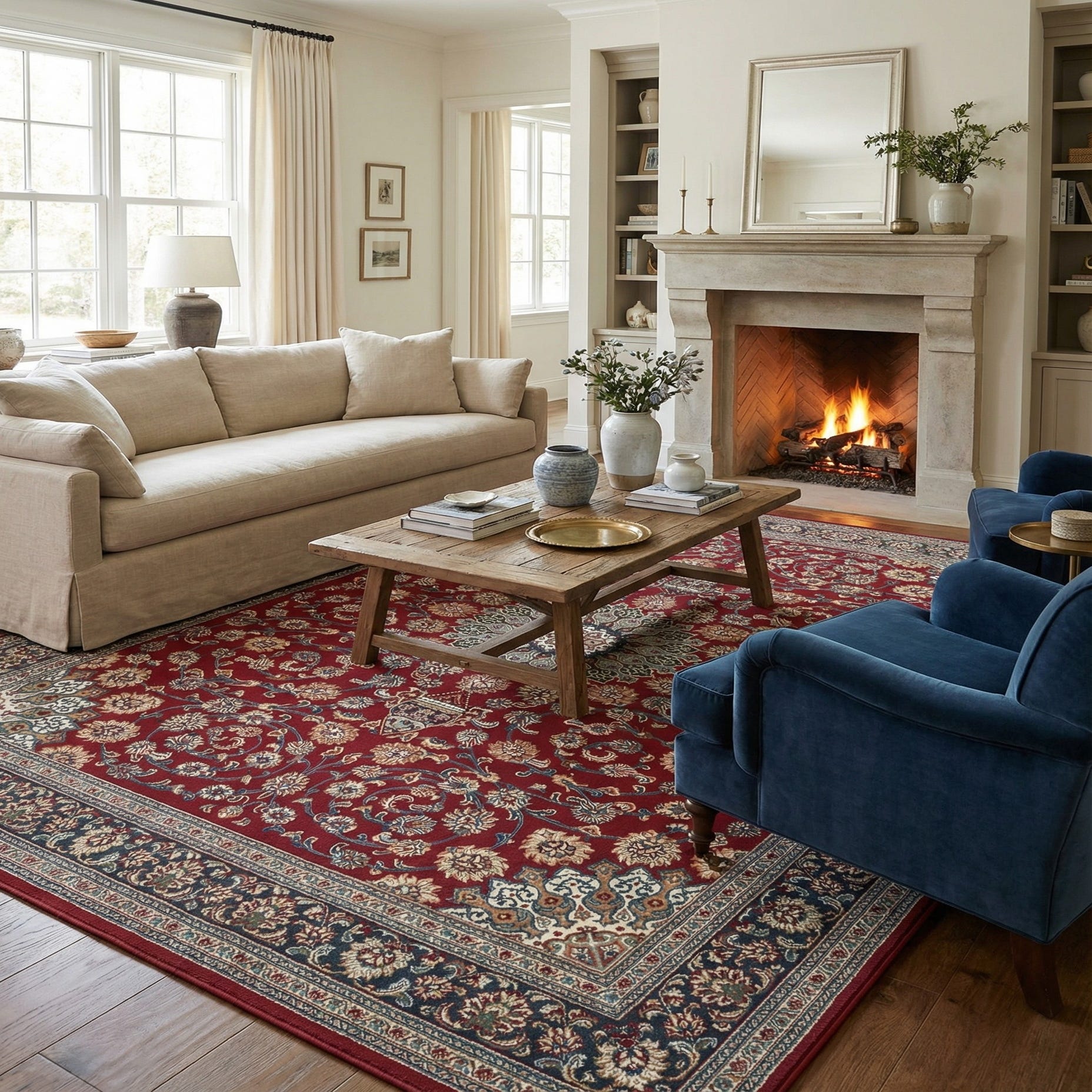 This piece works well as a grounding element in a formal living room under a coffee table, beneath a dining set to define the dining area, or on a covered porch to bring traditional character to an outdoor room. Pair it with warm wood furniture and leather upholstery to complement the red and brown tones, or use navy and ivory accents in pillows and drapery to pick up those cooler highlights for a balanced, layered look. The rug fits traditional interiors as well as transitional spaces that mix classic patterns with contemporary furnishings.