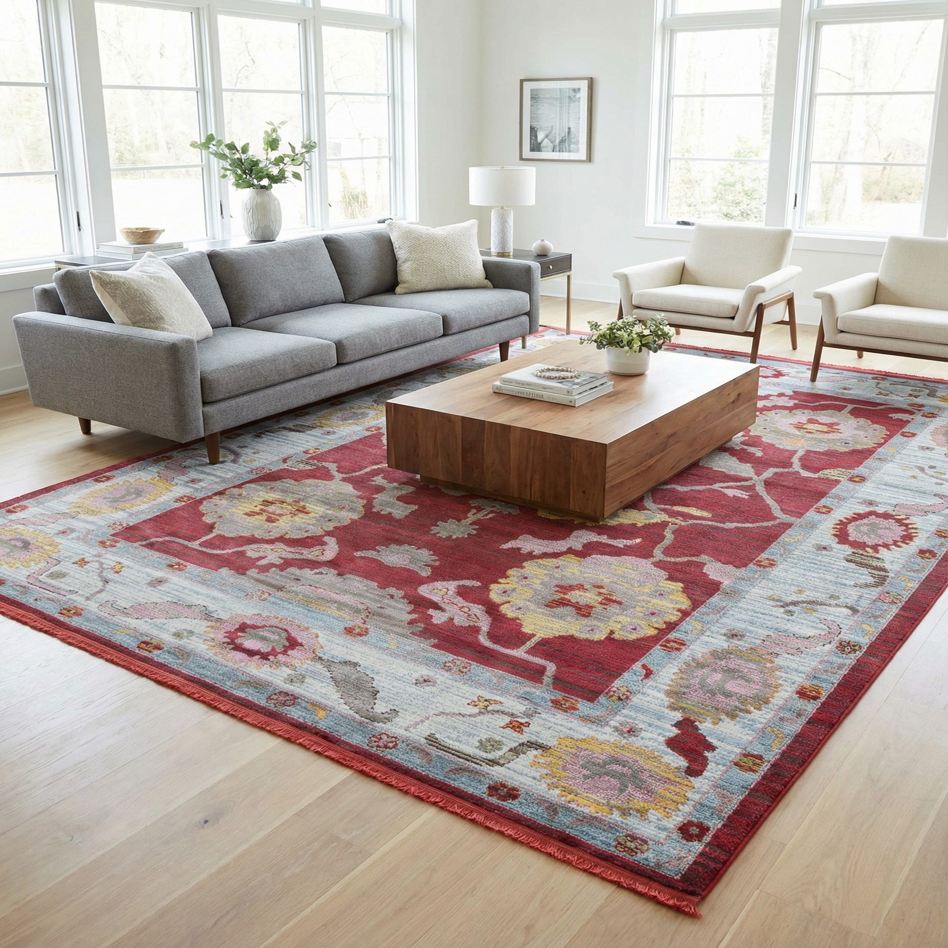 A vivid red field anchors a classic floral-and-vine composition, where large stylized blossoms and scrolling stems create a balanced, centered layout. The motifs are worked in soft shades of beige, ivory, gray, pink, light blue, blue and pops of yellow that sit against the red background and are echoed in the broad, pale blue-ivory border. Subtle tonal variation across the surface gives the pattern a hand-dyed feel, while the defined outlines of the flowers and curving leaves keep the design fresh and readable.