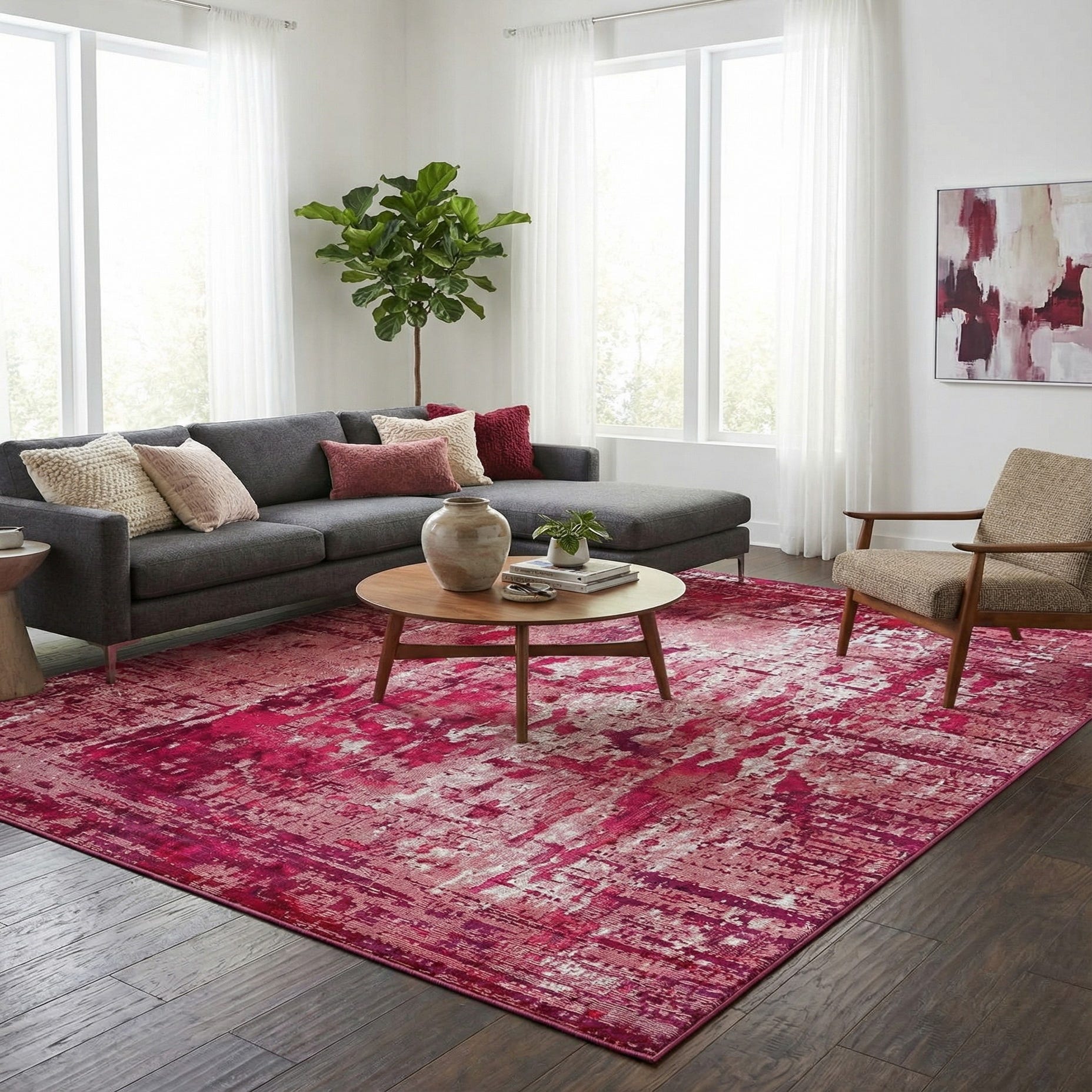 A 9x12 rectangular Starlight rug featuring a distressed modern abstract pattern in various shades of red and white.