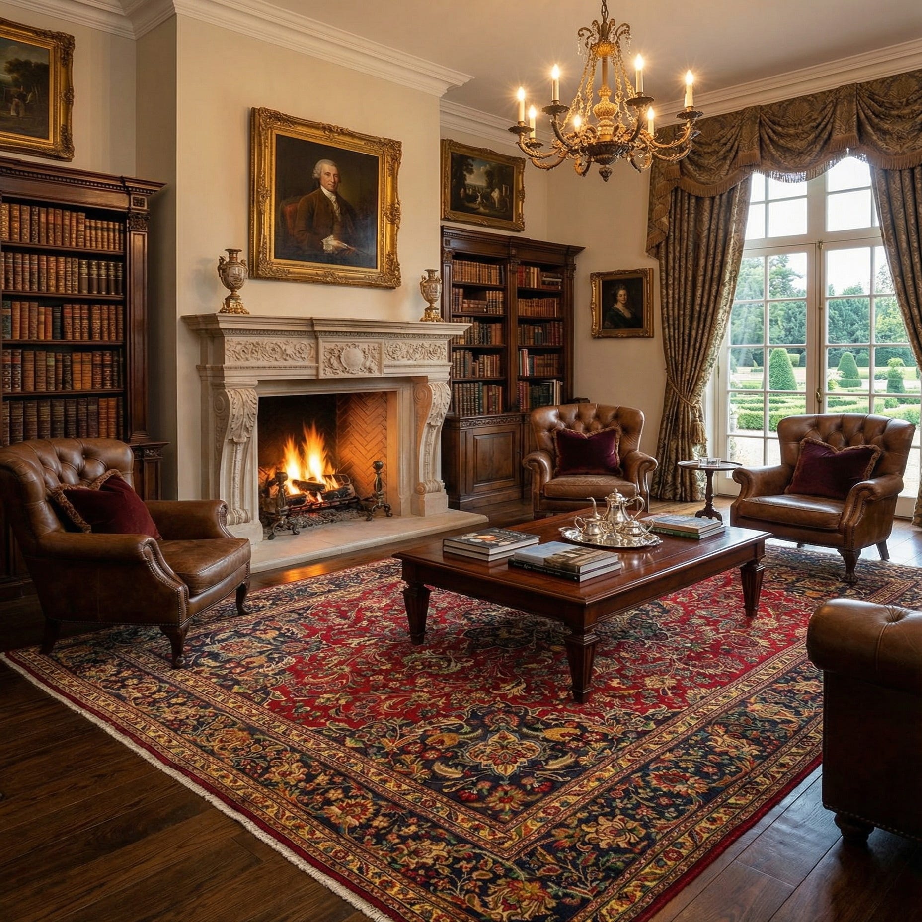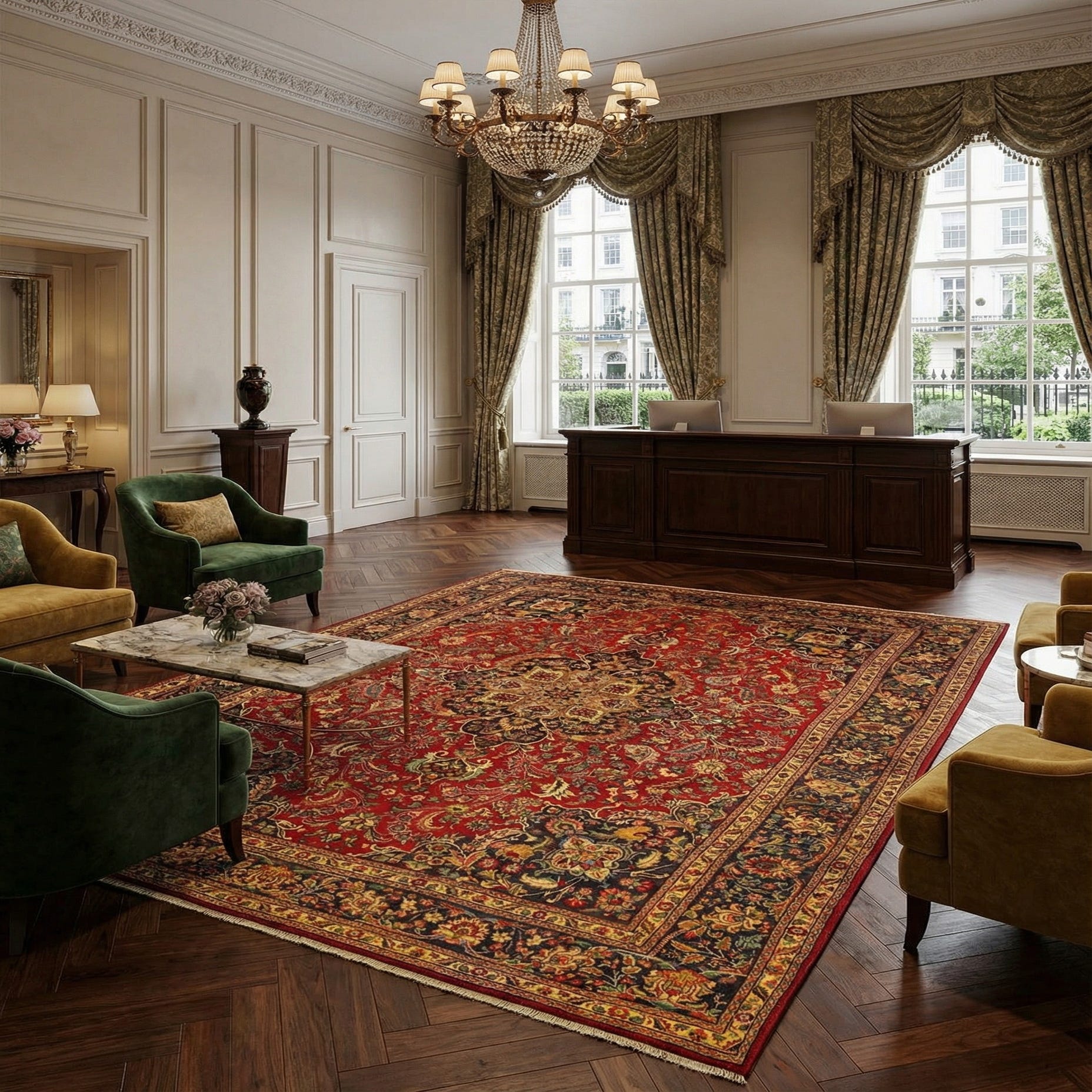 A luxurious 9x12 rectangular Persian rug in deep red with an intricate floral medallion pattern and a dark blue and gold border.