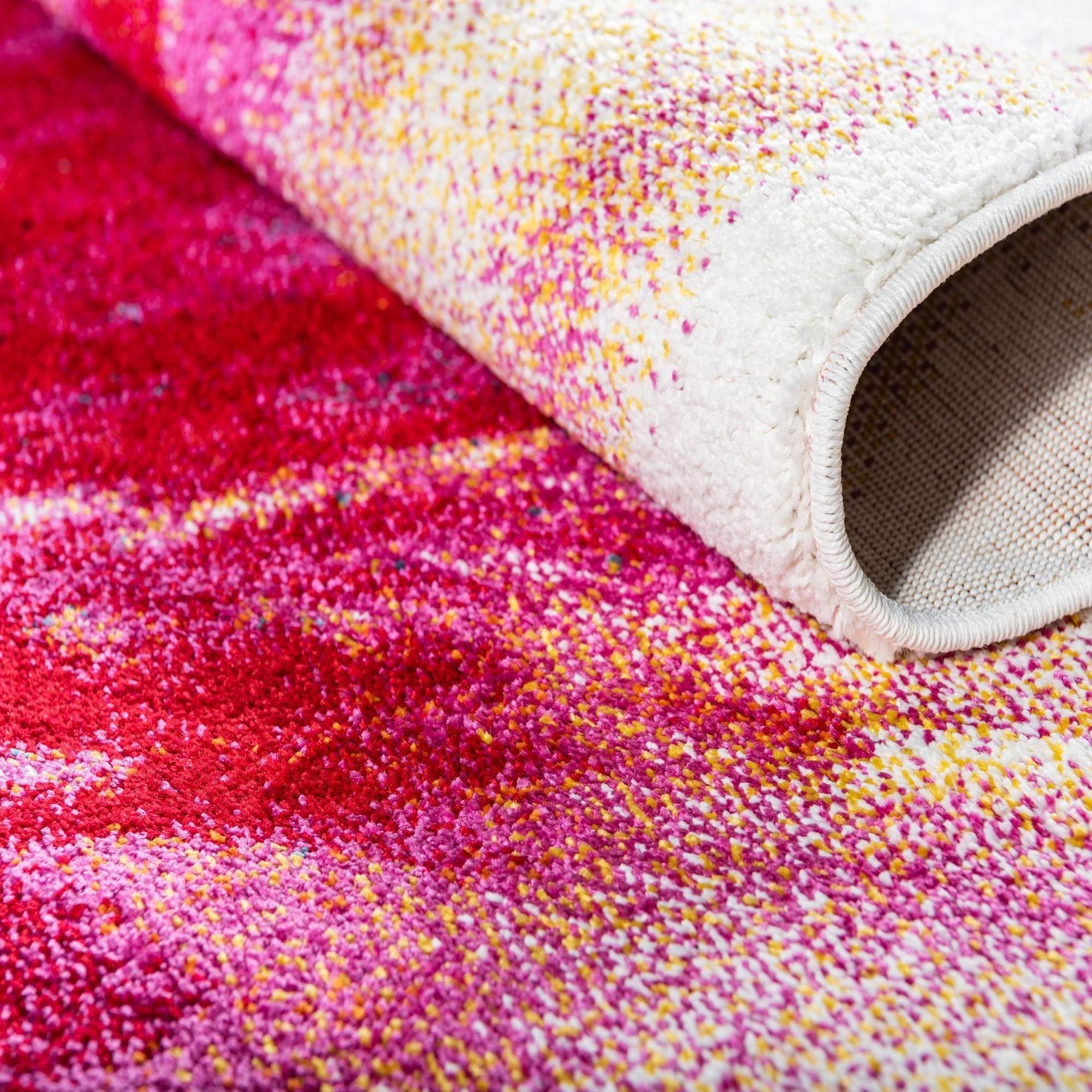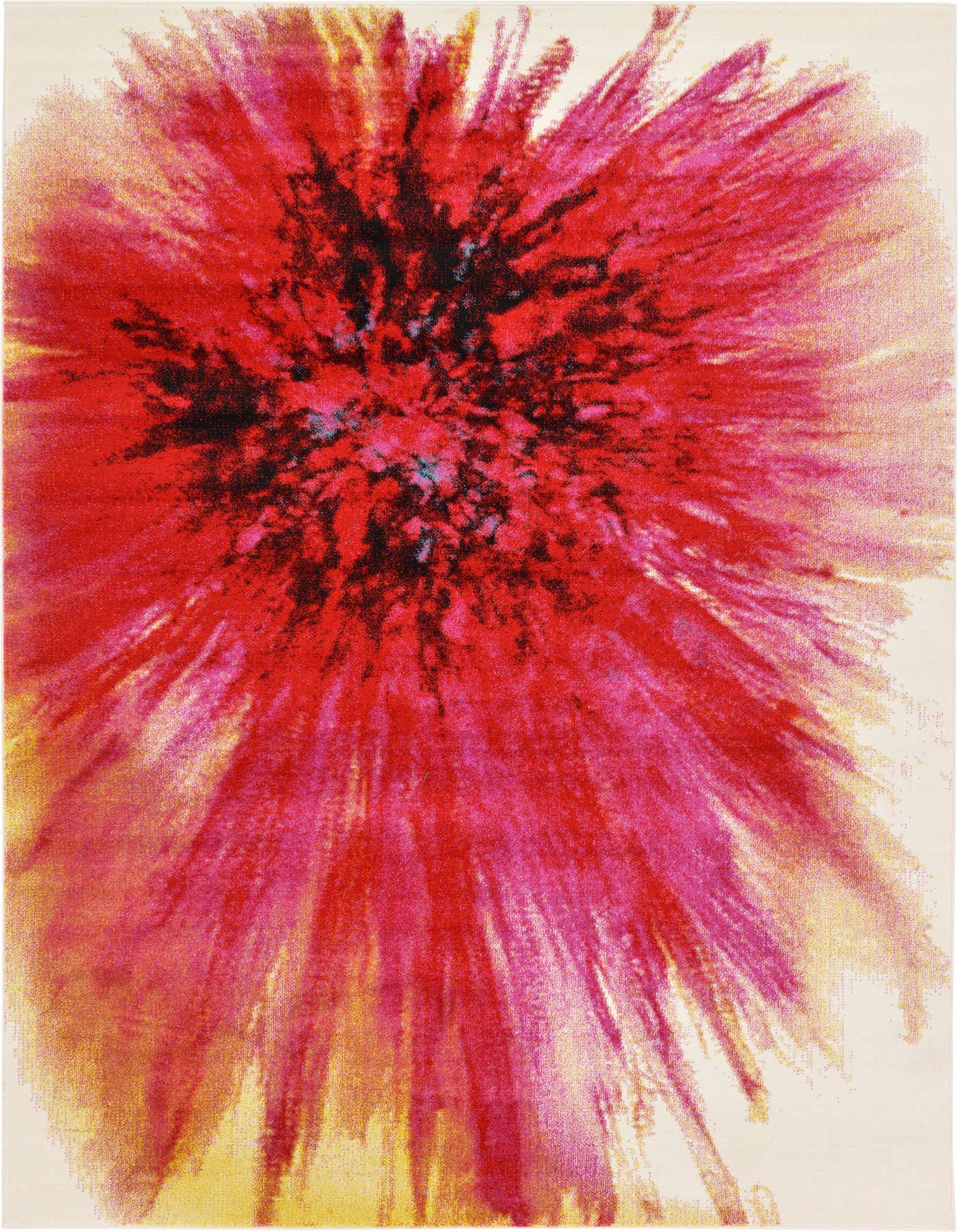 Primary color is Red. Colors in this rug include: Red, Black, Blue, Puce, Yellow, Ivory.