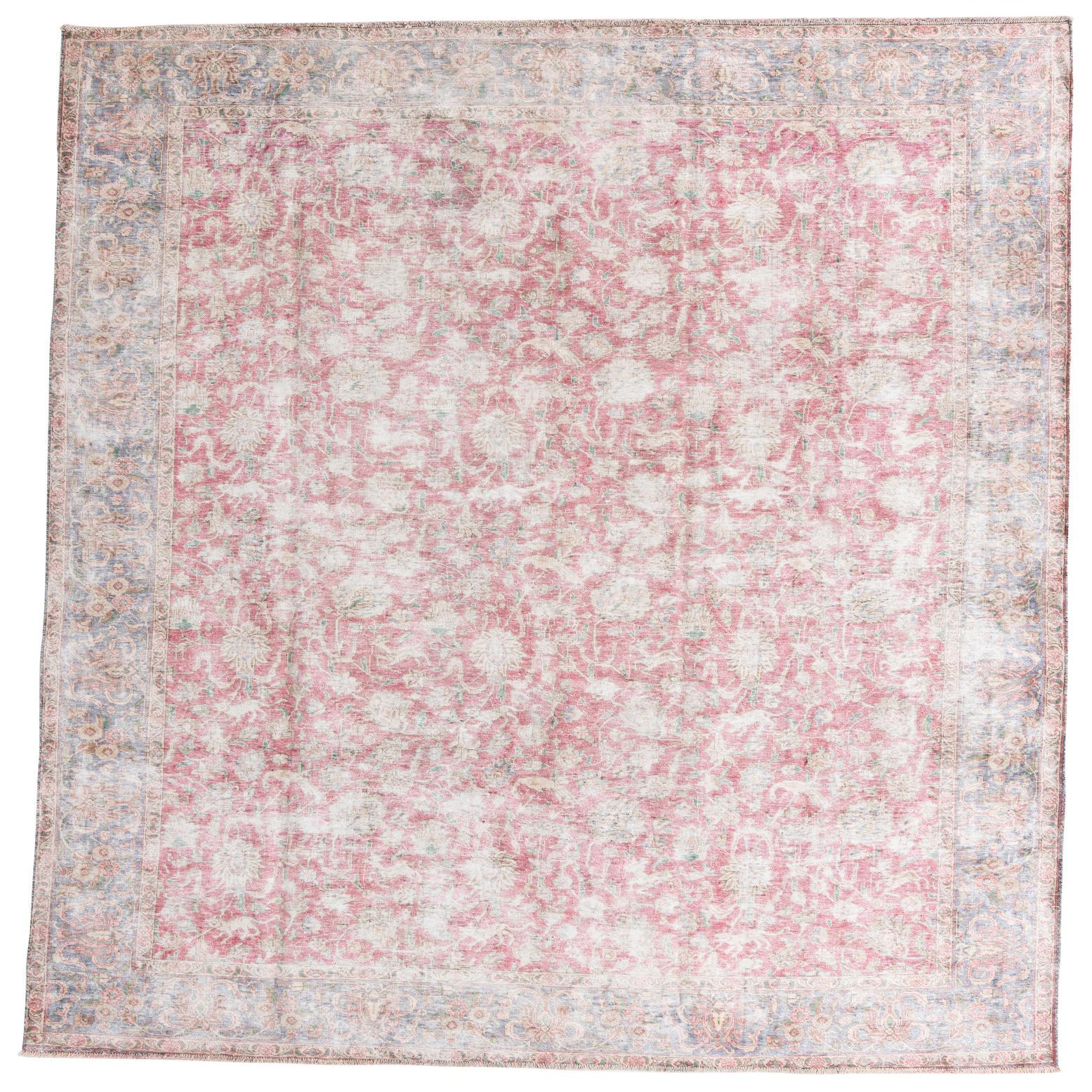 The rug's pattern features an intricate array of floral and ornamental designs, artfully distressed to create a time-worn aesthetic that translates into a look of effortless elegance. The fringe detailing at each end adds a finishing touch reminiscent of classic craftsmanship.