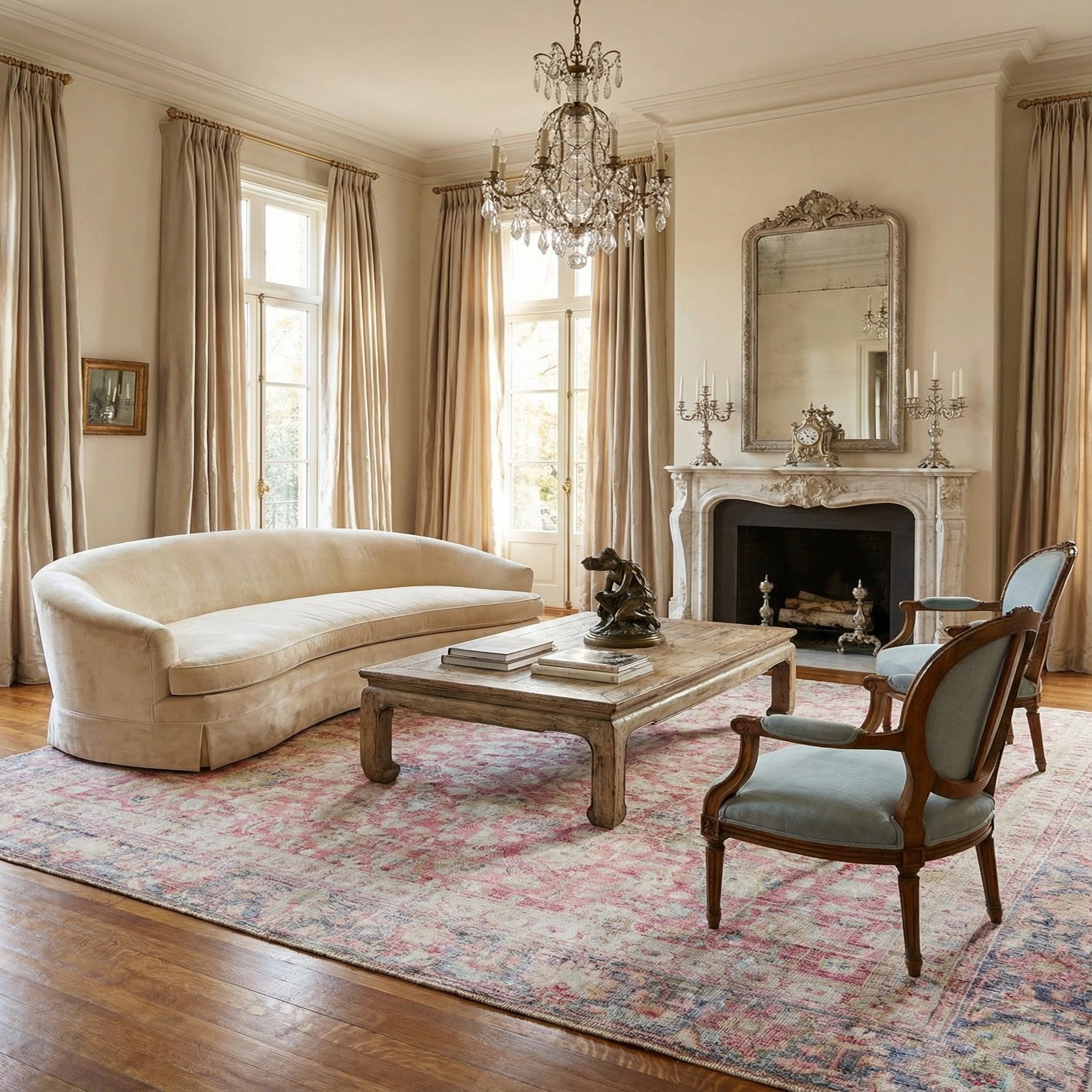 Its versatile design is well-suited for living rooms, dining areas, and bedrooms that aim to create a warm and inviting atmosphere with a touch of refined elegance. Spaces adorned with antique elements or rich wooden furnishings would particularly benefit from the rug's timeless appeal, while more modern decors could use it as an anchor to add a hint of character and depth.