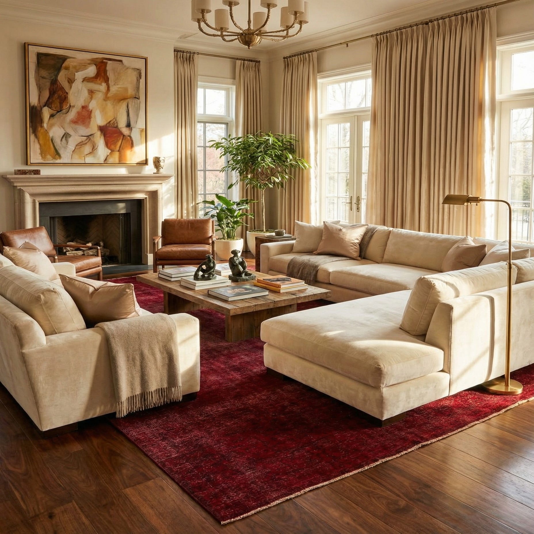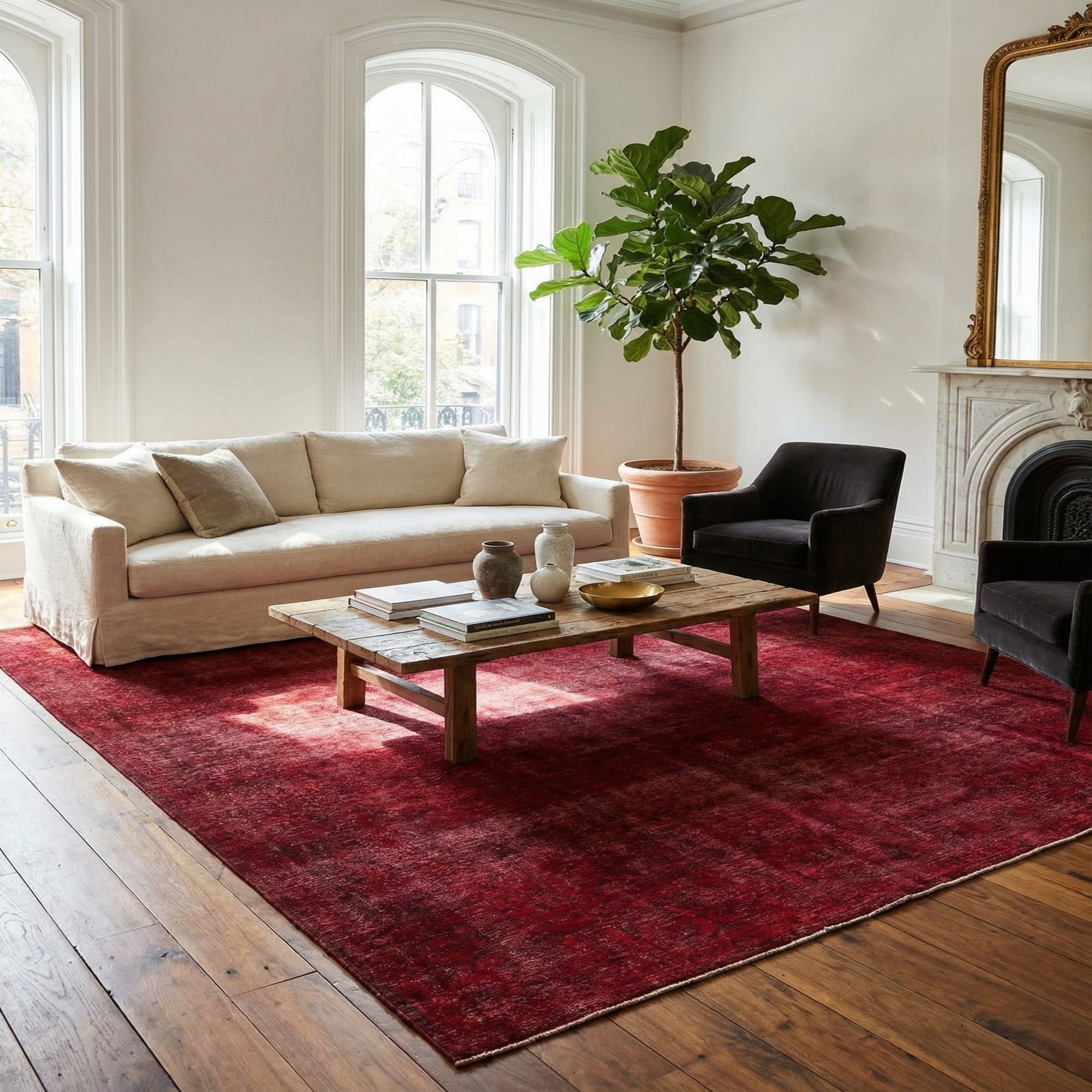 A 9x12 rectangular Ultra Vintage rug in deep red with a subtle, faded Persian-style pattern, suitable for a living room.