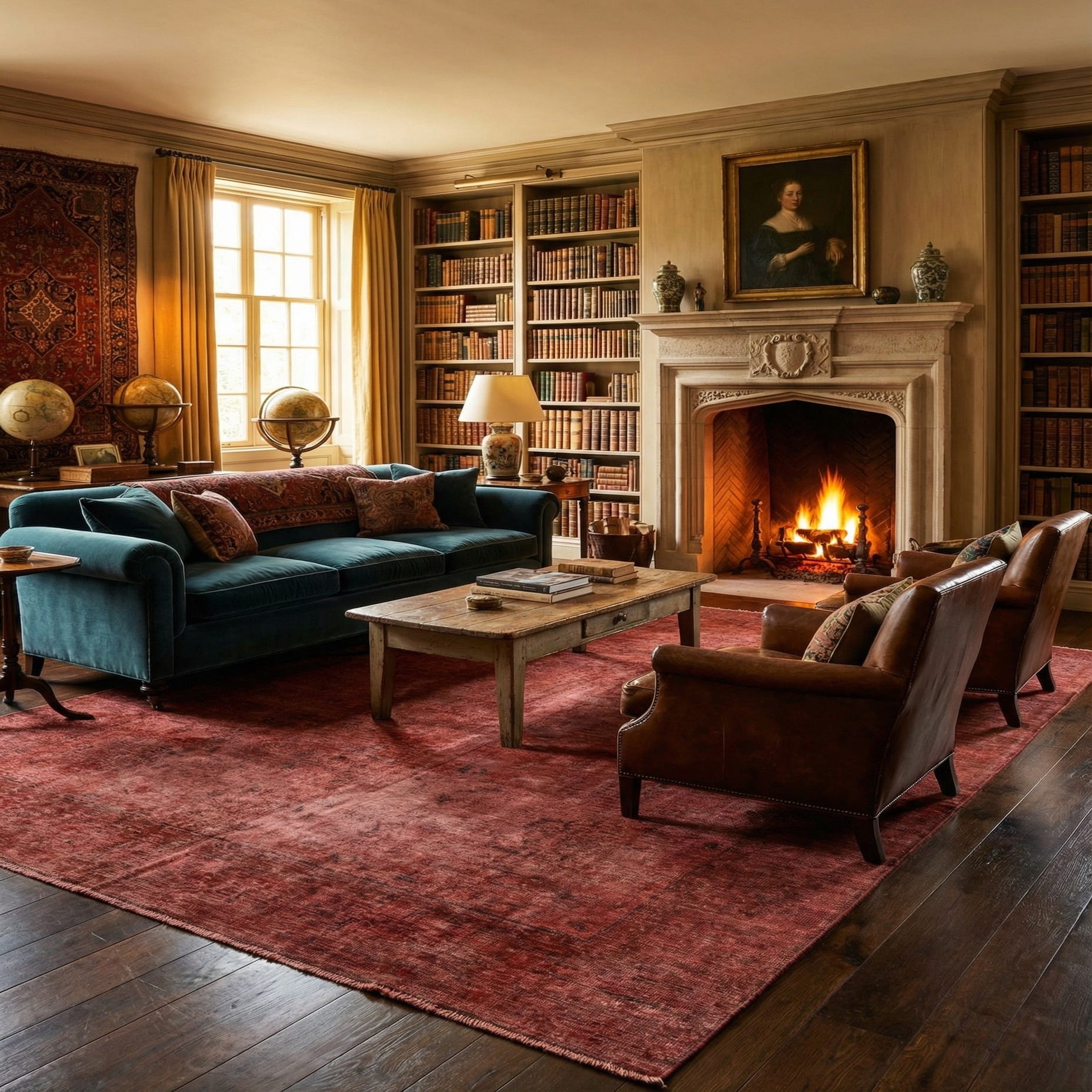 A large 9x12 rectangular red Persian-style area rug with a subtle vintage medallion pattern, ideal for a living room.