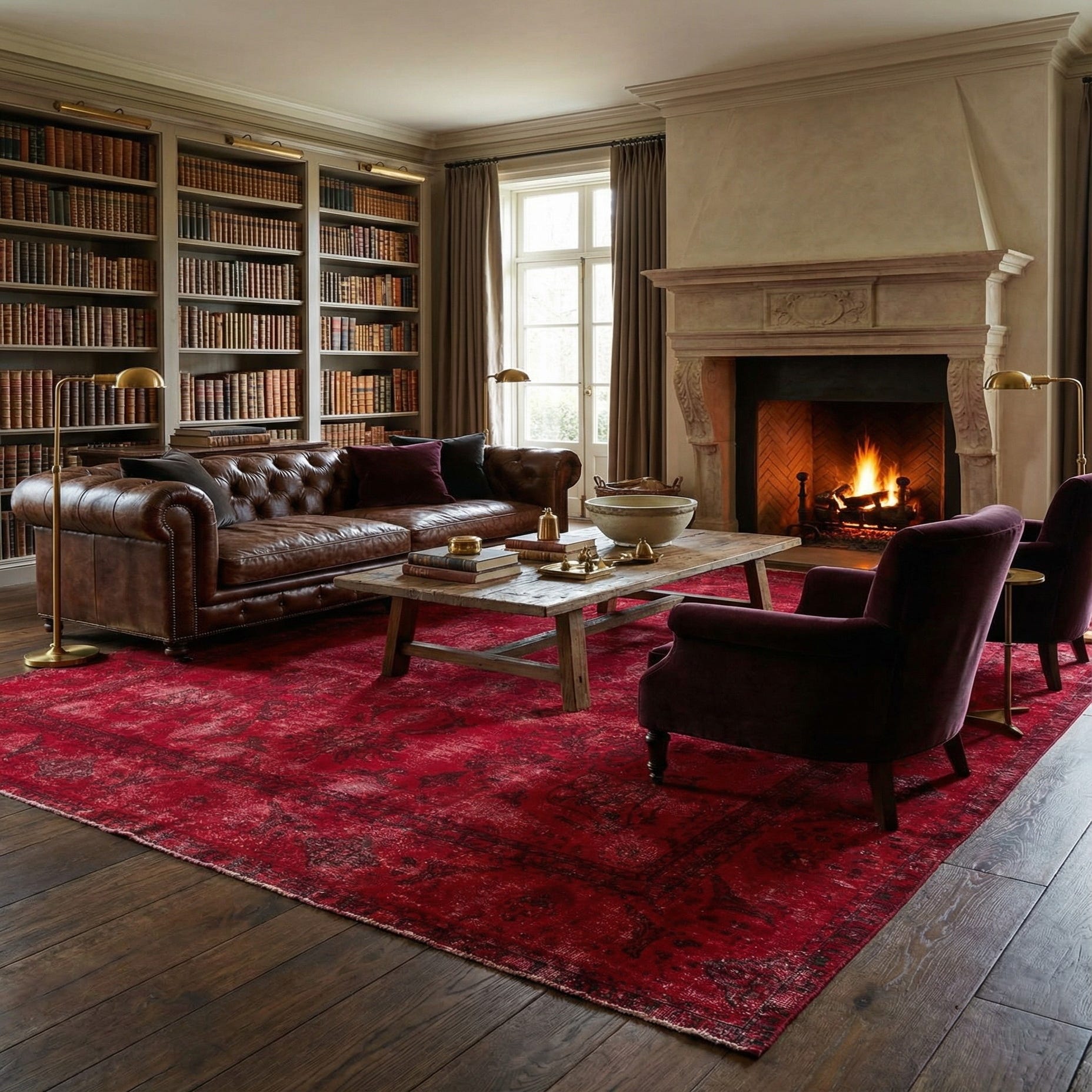 A 9x12 rectangular Ultra Vintage rug in deep red with faded black Persian medallion and floral patterns, suitable for a living room.