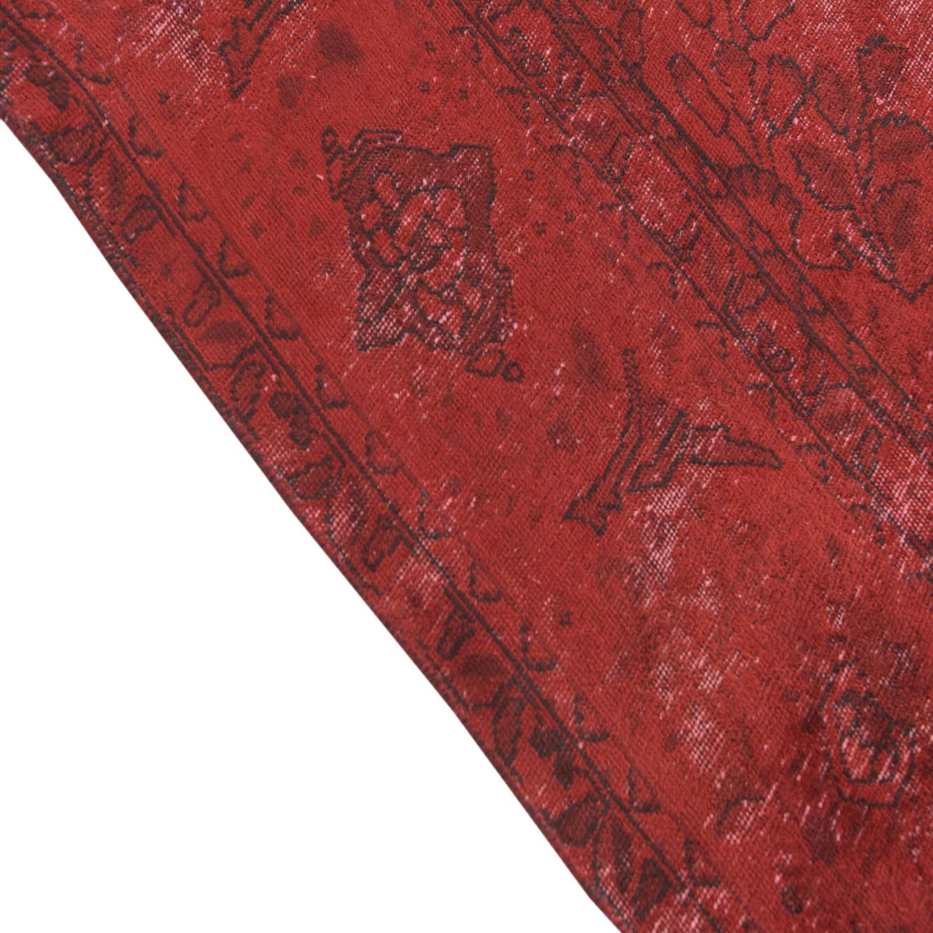 The rug's densely woven wool fibers offer a plush feel underfoot, providing both comfort and durability. While the deep red hue anchors the rug as a statement piece, the contrasting black detailing makes it versatile in varied design settings. Ideal for areas that seek to combine a warm, inviting atmosphere with a nod to traditional aesthetics, this rug would complement an array of interior designs from classic to eclectic. It could serve as a focal point in a formal living room, add a touch of elegance to a dining area, or bring warmth to a master bedroom with wooden or neutral undertones.