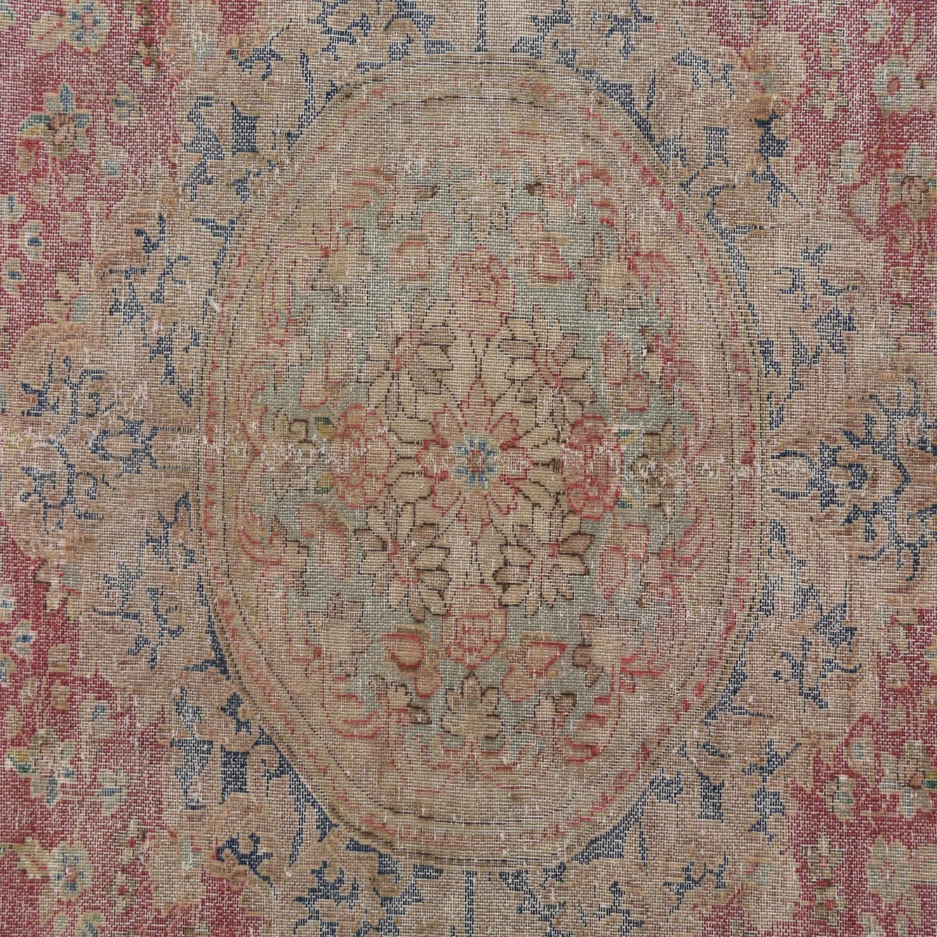 A distressed 9x12 rectangular red Persian rug with a central medallion and blue border, ideal for a living room.