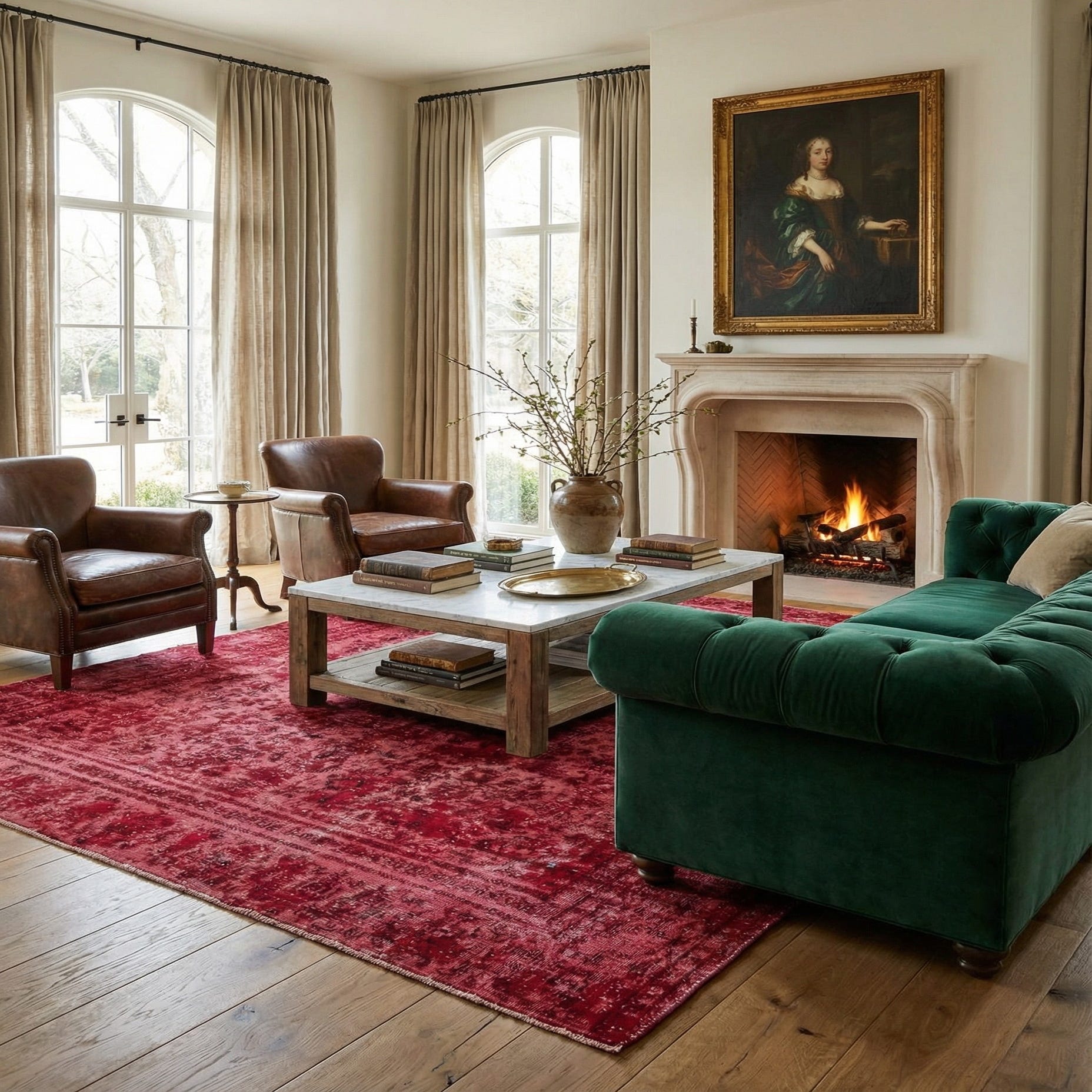 A 9x12 rectangular Ultra Vintage rug in deep red with a faded Persian medallion pattern, suitable for a living room.