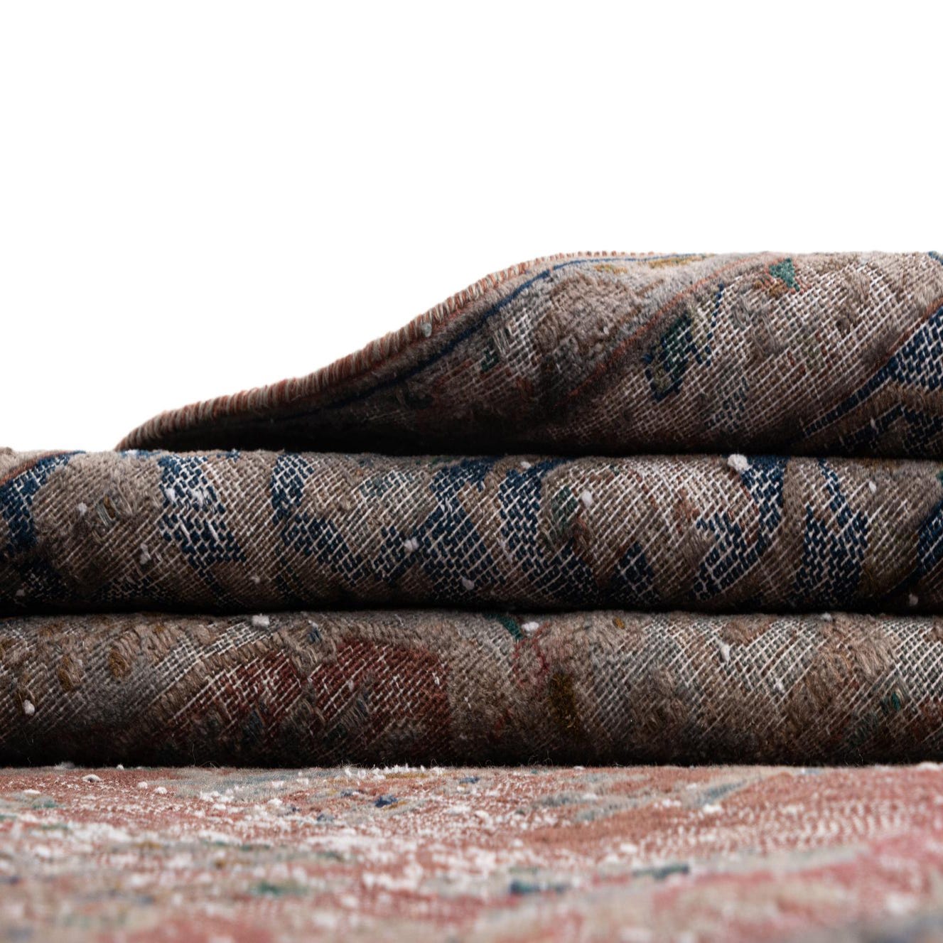 A 9x12 rectangular Persian rug with a faded red central field and a distressed blue and beige border.