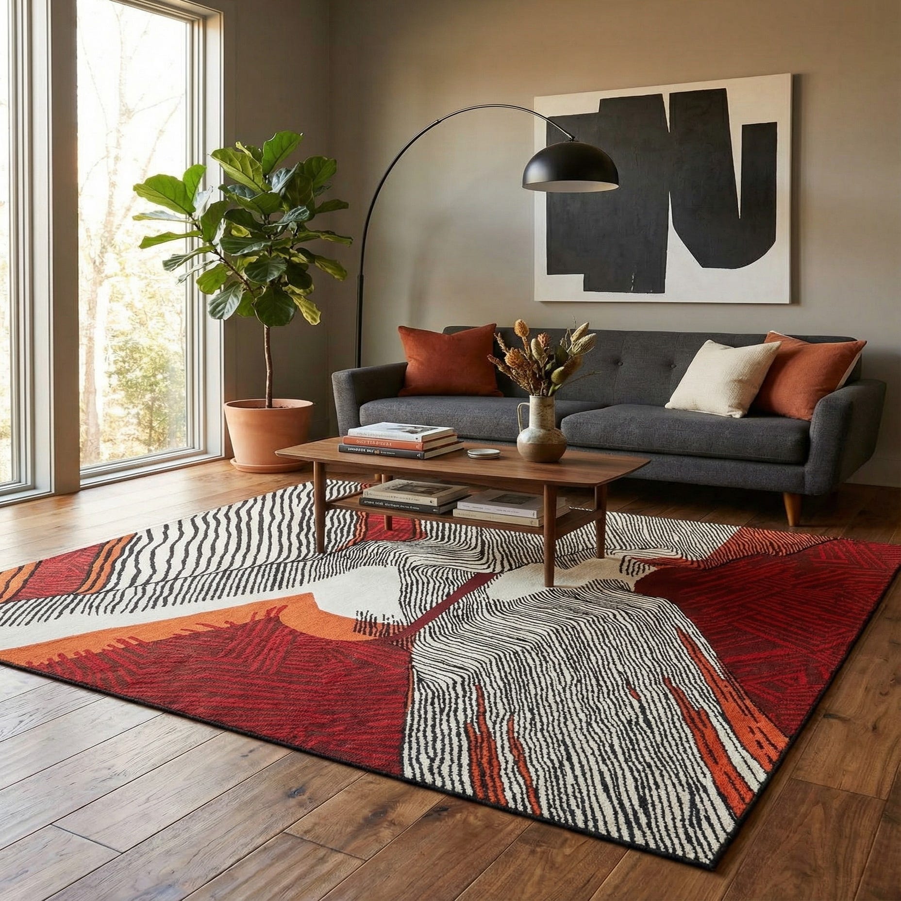 A square 8'x8' modern abstract rug featuring a dynamic pattern of black lines on white, contrasted with bold red and orange sections, suitable for a patio.