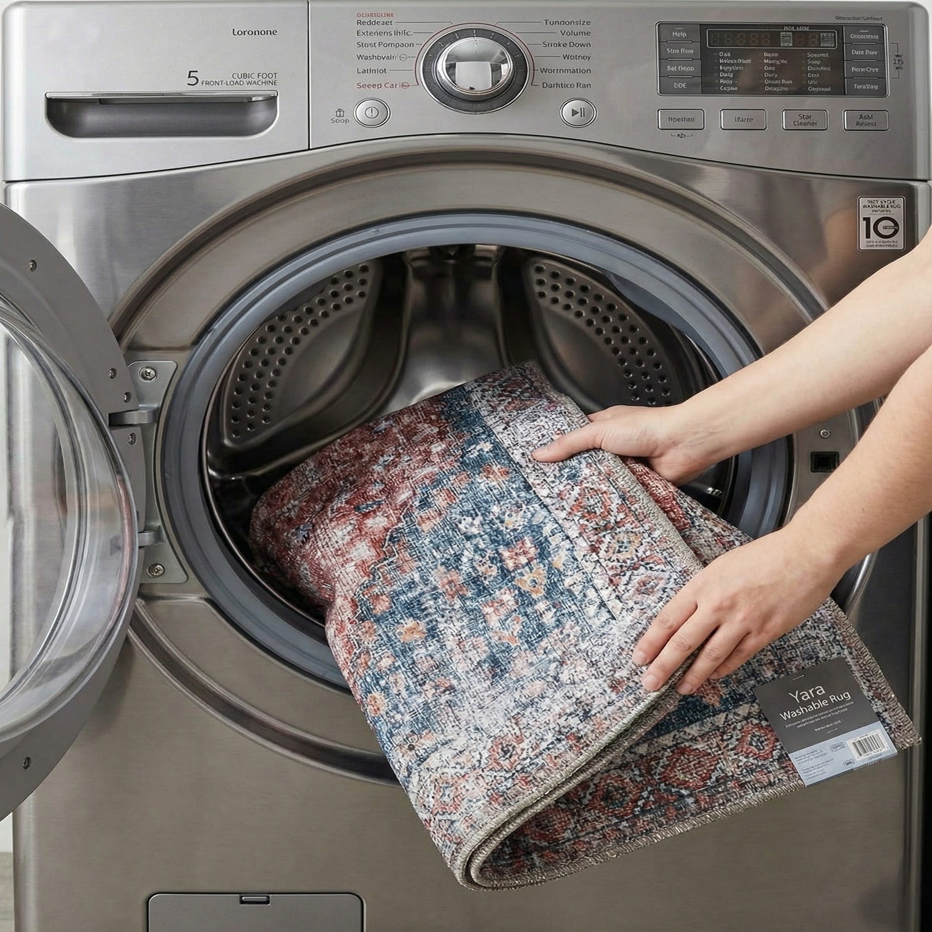 This rug works well as an anchor in a small seating area, a layered accent in front of a sofa, or as a pattern-rich addition at the foot of a bed. It complements warm wood tones, navy upholstery and mixed-textile interiors, and fits comfortably in transitional, bohemian, or relaxed farmhouse schemes where a touch of vintage-inspired color and texture helps pull the room together.
