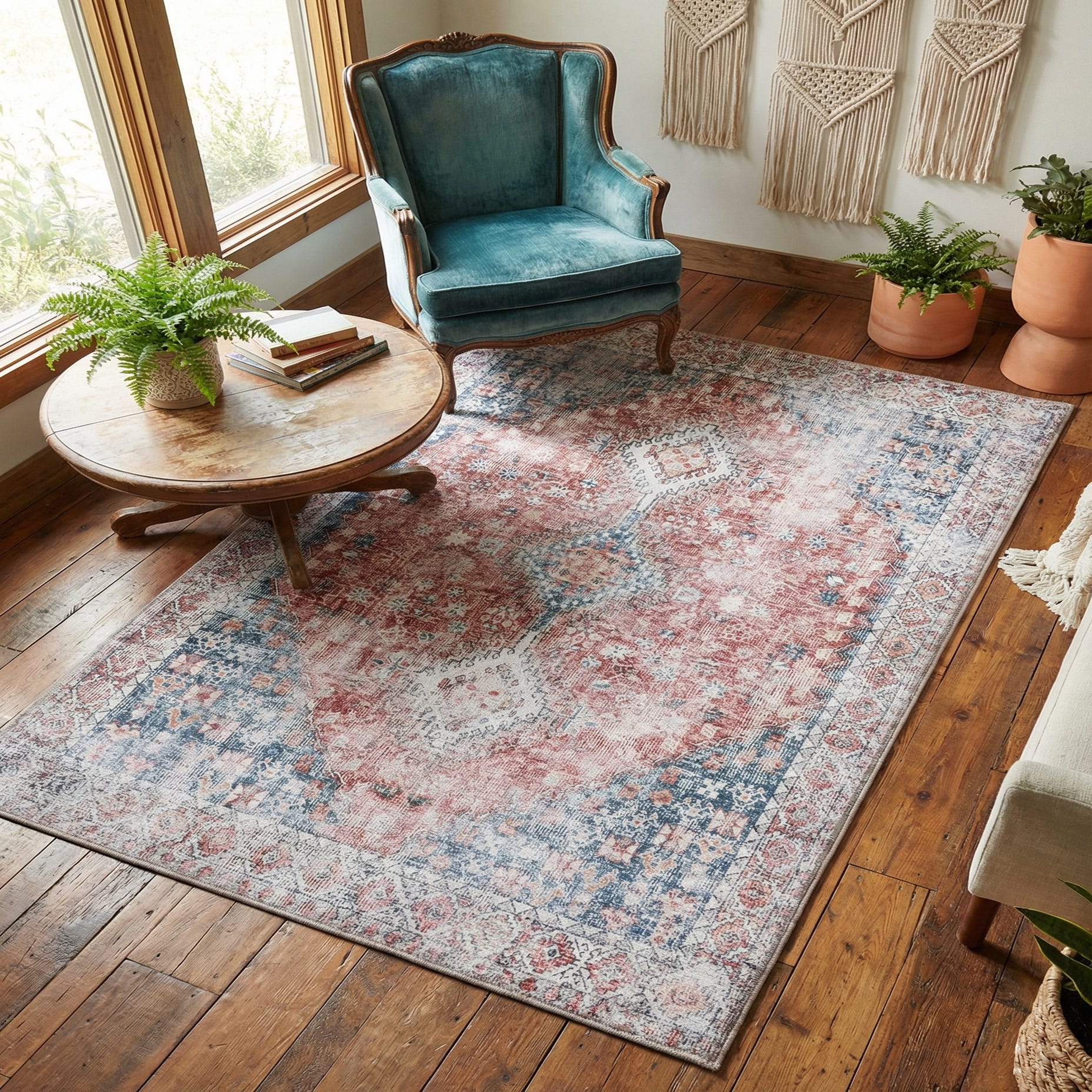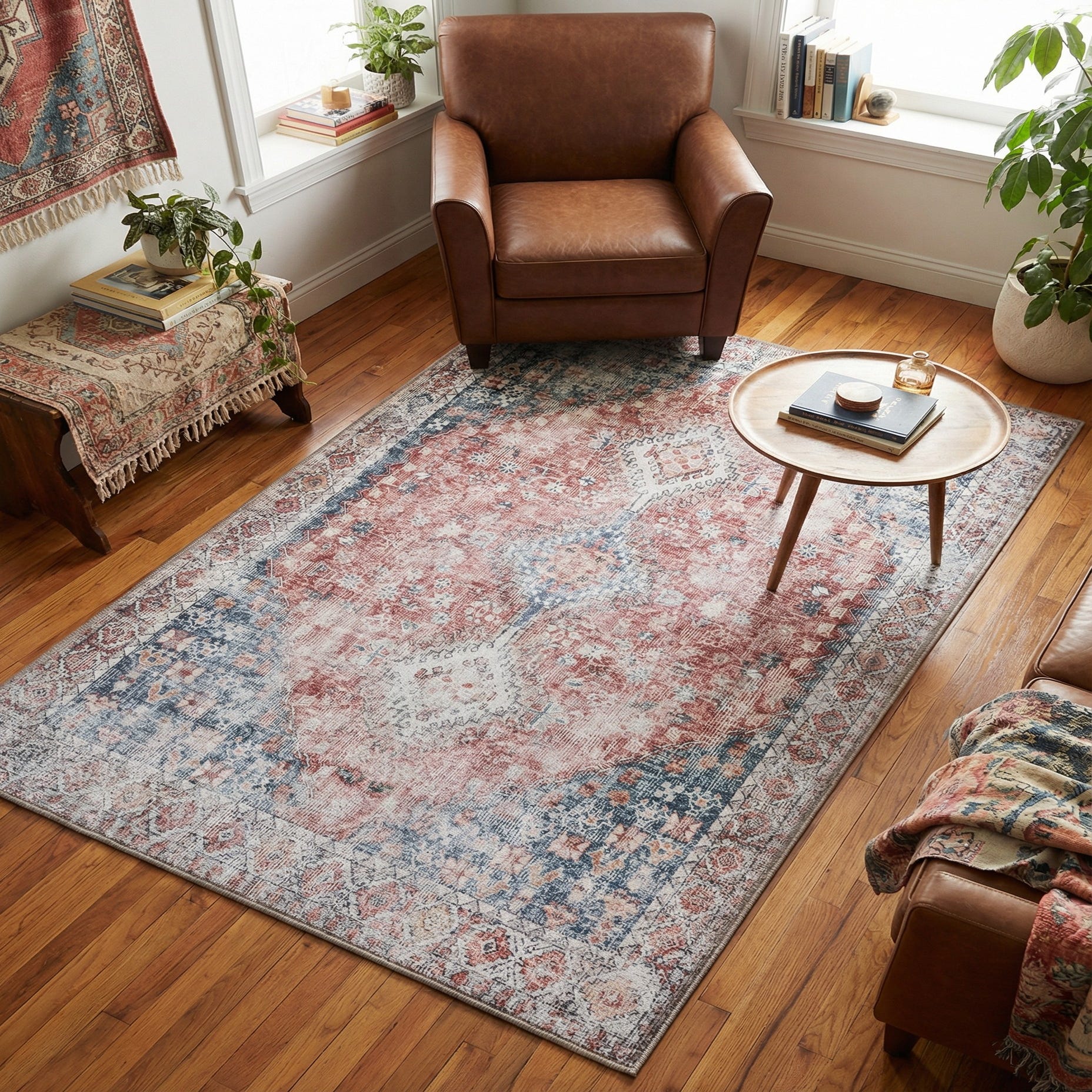 A worn-vintage medallion pattern gives this rug an old-world character, with a rich Red and Navy Blue background that anchors the design. Faded ivory medallions and delicate floral motifs sit amid soft blue and brown accents, creating a layered, timeworn look. The border carries a subtle geometric repeat that frames the field without overpowering it, while the overall distressed finish balances traditional Persian influence with a relaxed, modern sensibility.