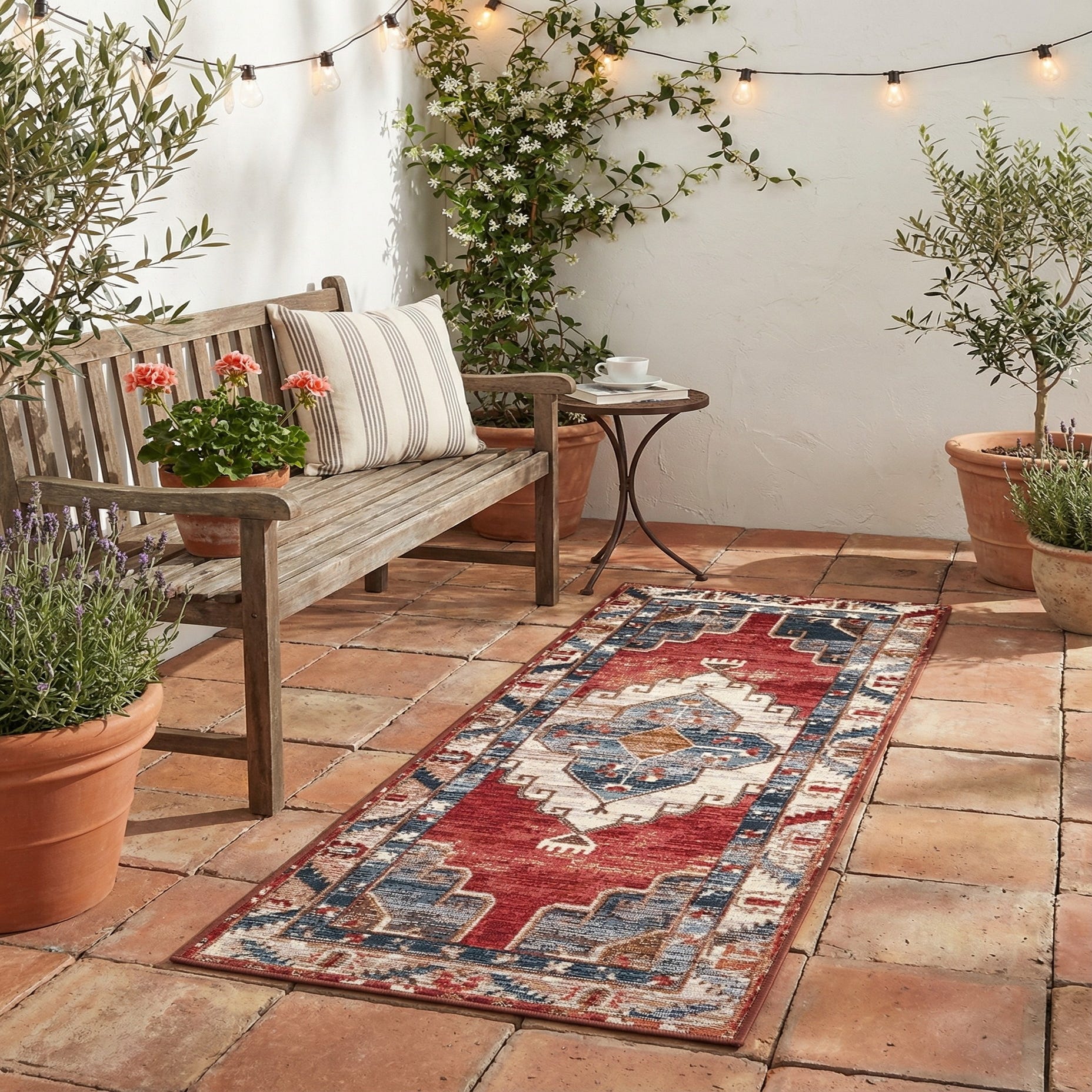 A 5 ft runner rug in red and navy blue with a traditional medallion pattern, suitable for hallways or patios.
