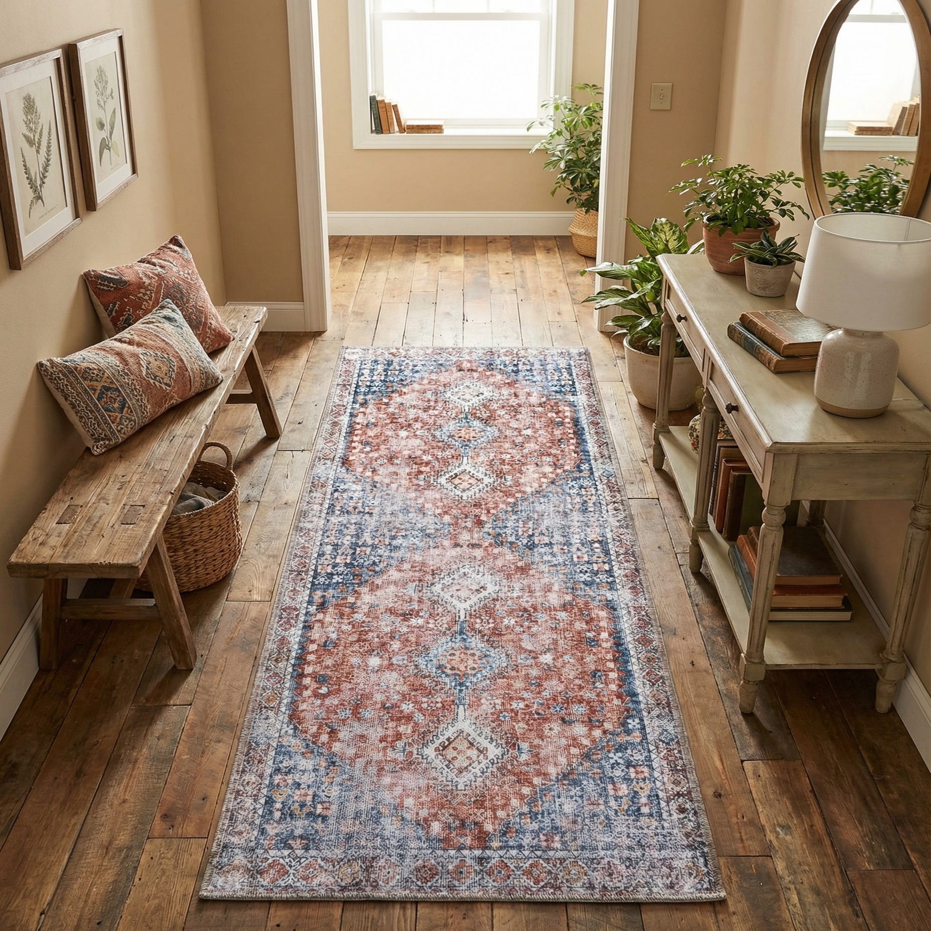 A 5 ft runner rug with a distressed red and navy blue traditional pattern, suitable for a hallway.