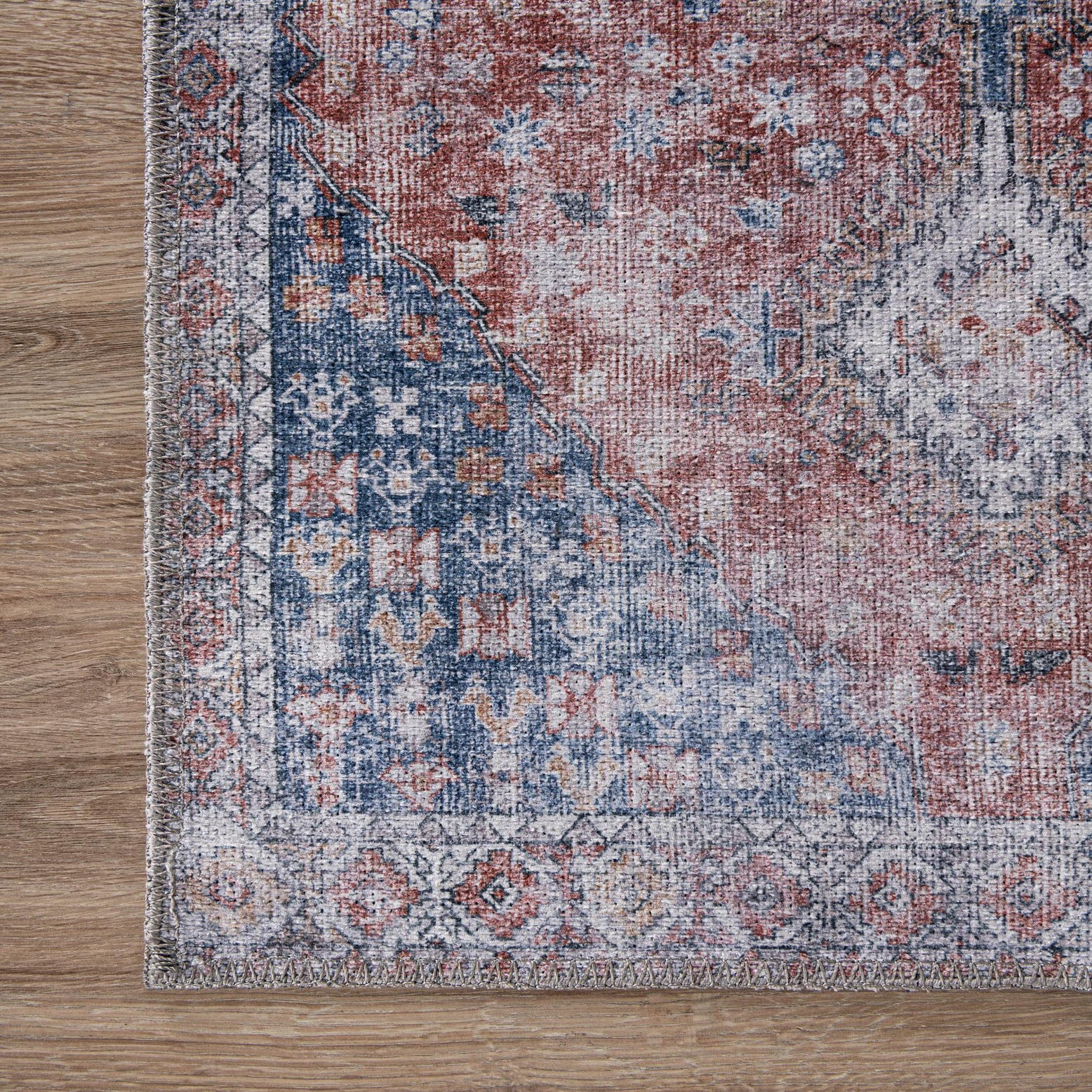 A softly distressed medallion pattern fills a warm red and navy blue ground, with three stacked diamond motifs running down the center and a delicate geometric border framing the field. The design blends faded florals and small-scale motifs in shades of blue, brown and ivory, giving the rug a lived-in, vintage-inspired look. The surface reads as textured from a short, dense weave—chenille yarns provide a velvety, touchable softness while polyester threads create subtle sheen and structure.
