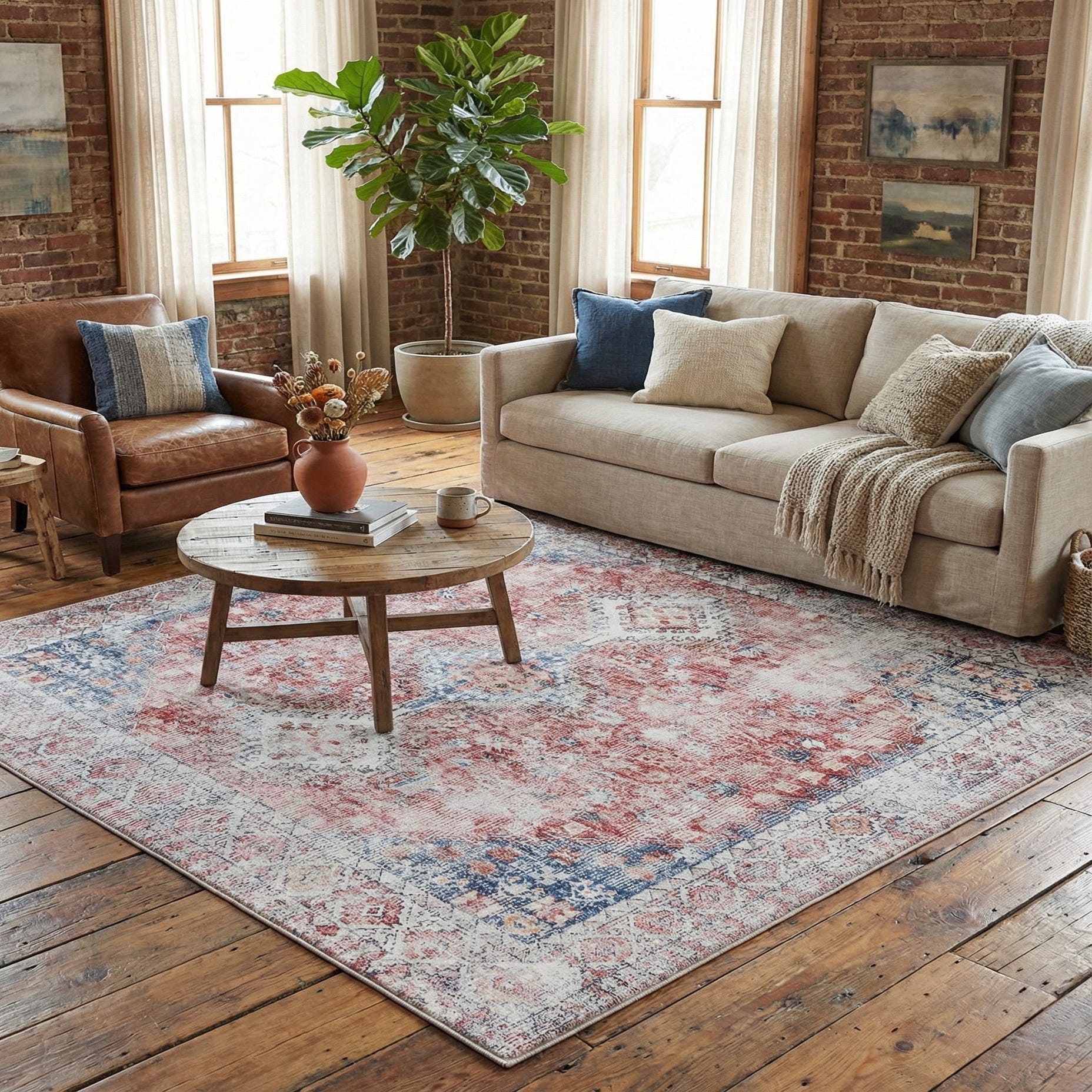 Machine-made from polyester and chenille, the surface has a soft, slightly velvety hand with a low-profile pile that stays comfortable underfoot while keeping a neat silhouette. This palette and worn aesthetic work well in a transitional living room beneath a seating group, layered under a bed in a cozy bedroom, or anchoring a dining area with warm wood furniture. It also complements eclectic, farmhouse, or coastal-inspired interiors when paired with navy upholstery, ivory textiles, and natural wood finishes.