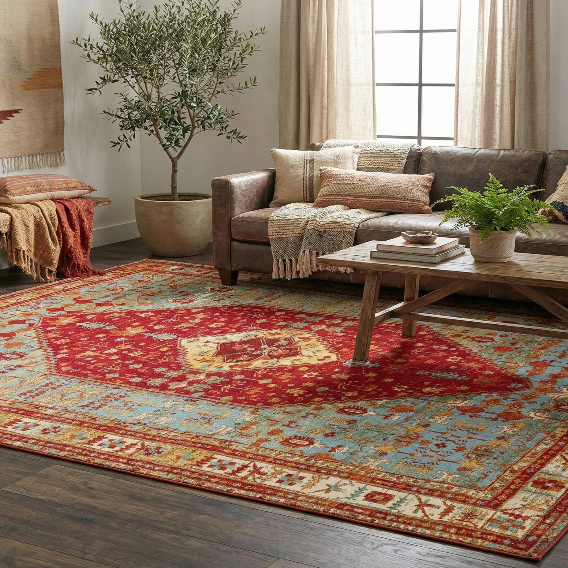 A 10x13 rectangular indoor/outdoor rug featuring a vibrant red medallion on a blue and green traditional Oriental pattern.