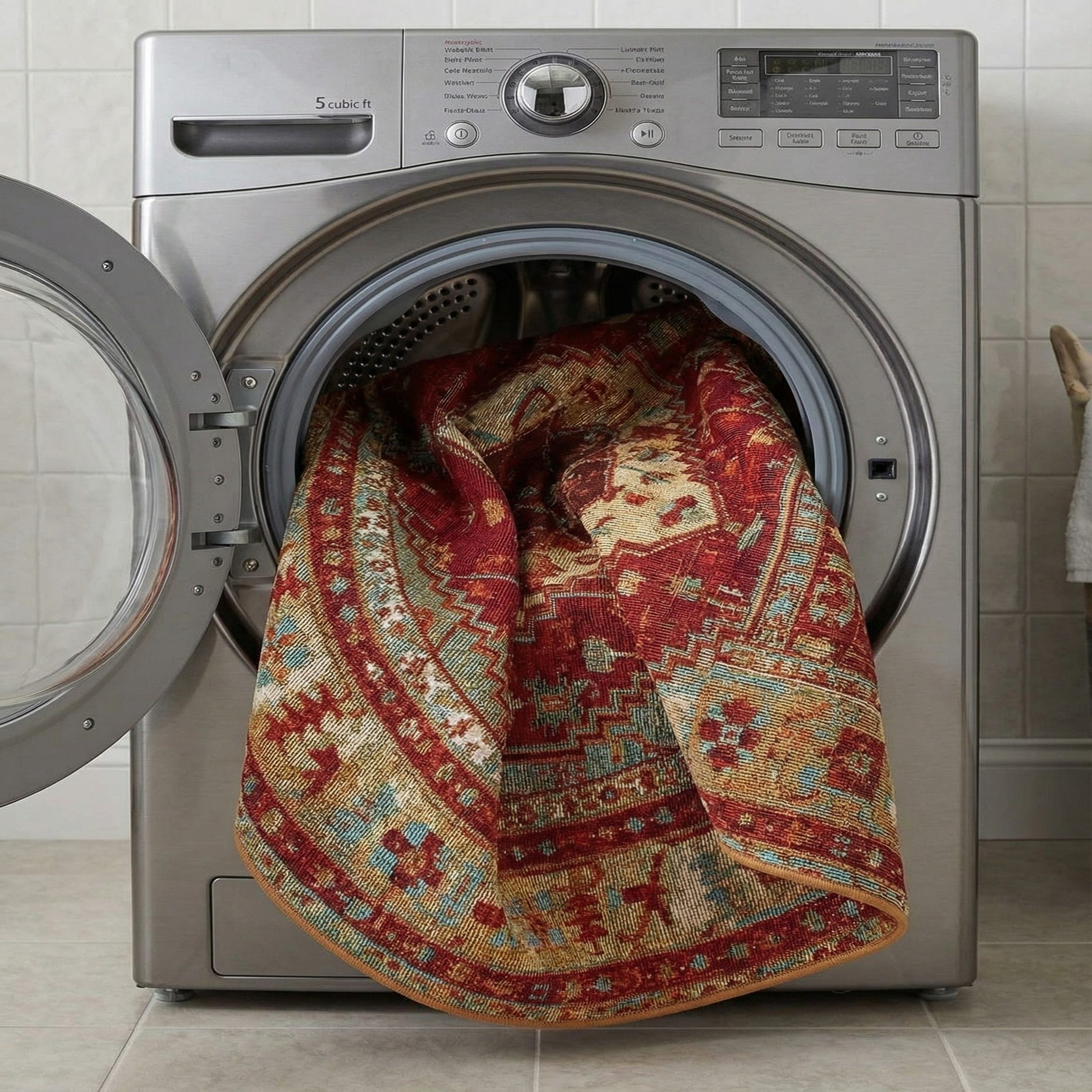 This piece works well under a small bistro table on a covered porch, as the anchor for a cozy sunroom seating area, or layered in a living room to introduce color and pattern without overpowering the space. Pair it with weathered wood or rattan furniture, warm leather seating, and textiles in terracotta, teal or olive for a cohesive look; the round shape also centers intimate dining vignettes and conversational groupings.