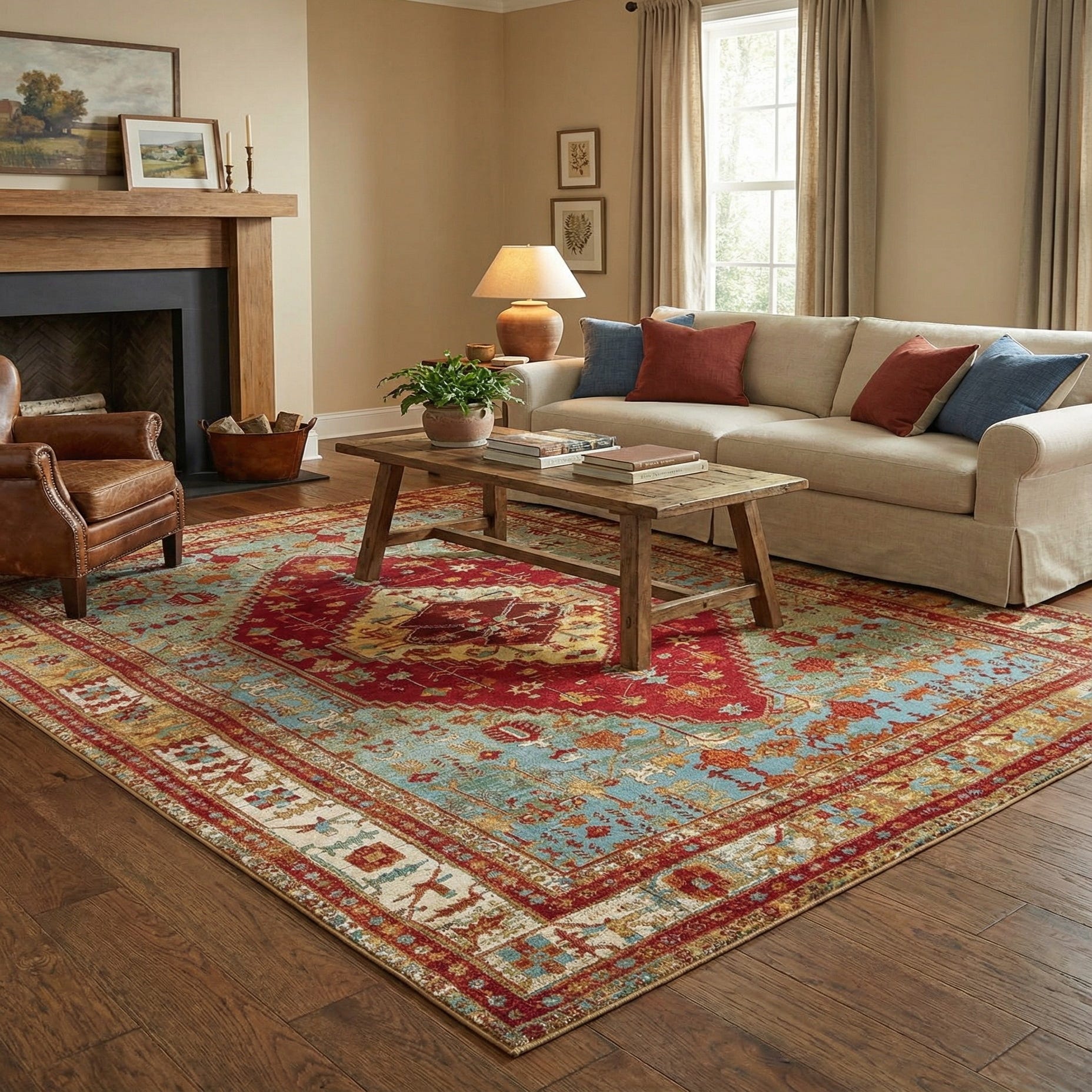 A bold, traditional medallion design anchors this rug with a stepped red center set against a Red Green Blue background. Detailed floral and geometric motifs in gold and ivory thread through the field, with blue and green accents adding depth to the pattern. Multiple narrow borders in complementary reds, golds and ivories frame the composition, giving a layered, classic look that pairs historic styling with a refreshed color story.