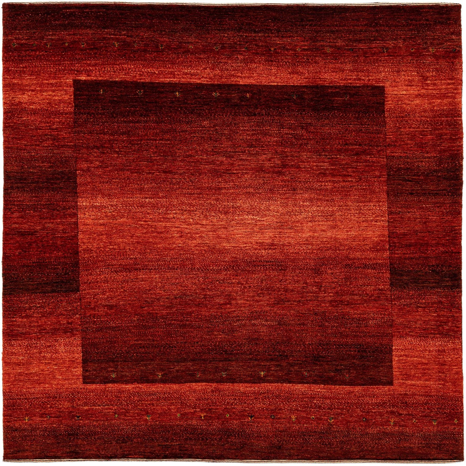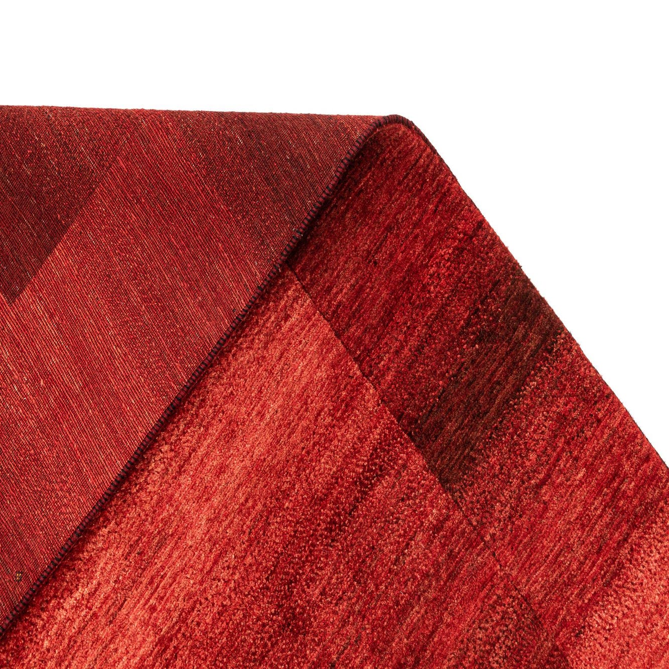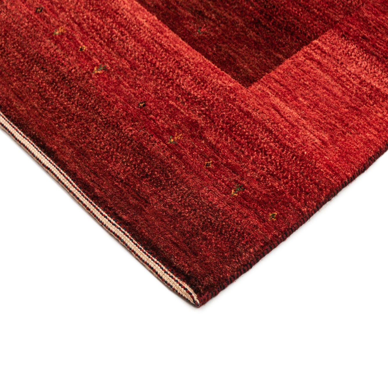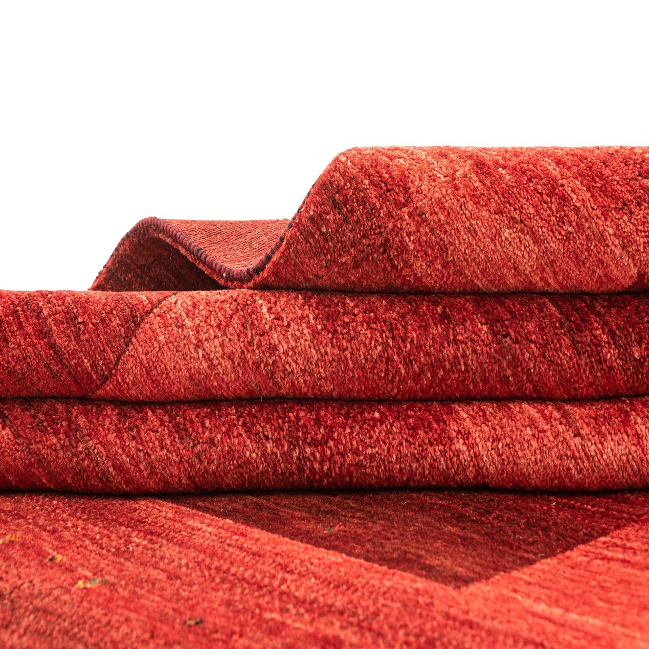 Handmade rectangular Persian rug in varying shades of red, featuring a darker red border with subtle accents.