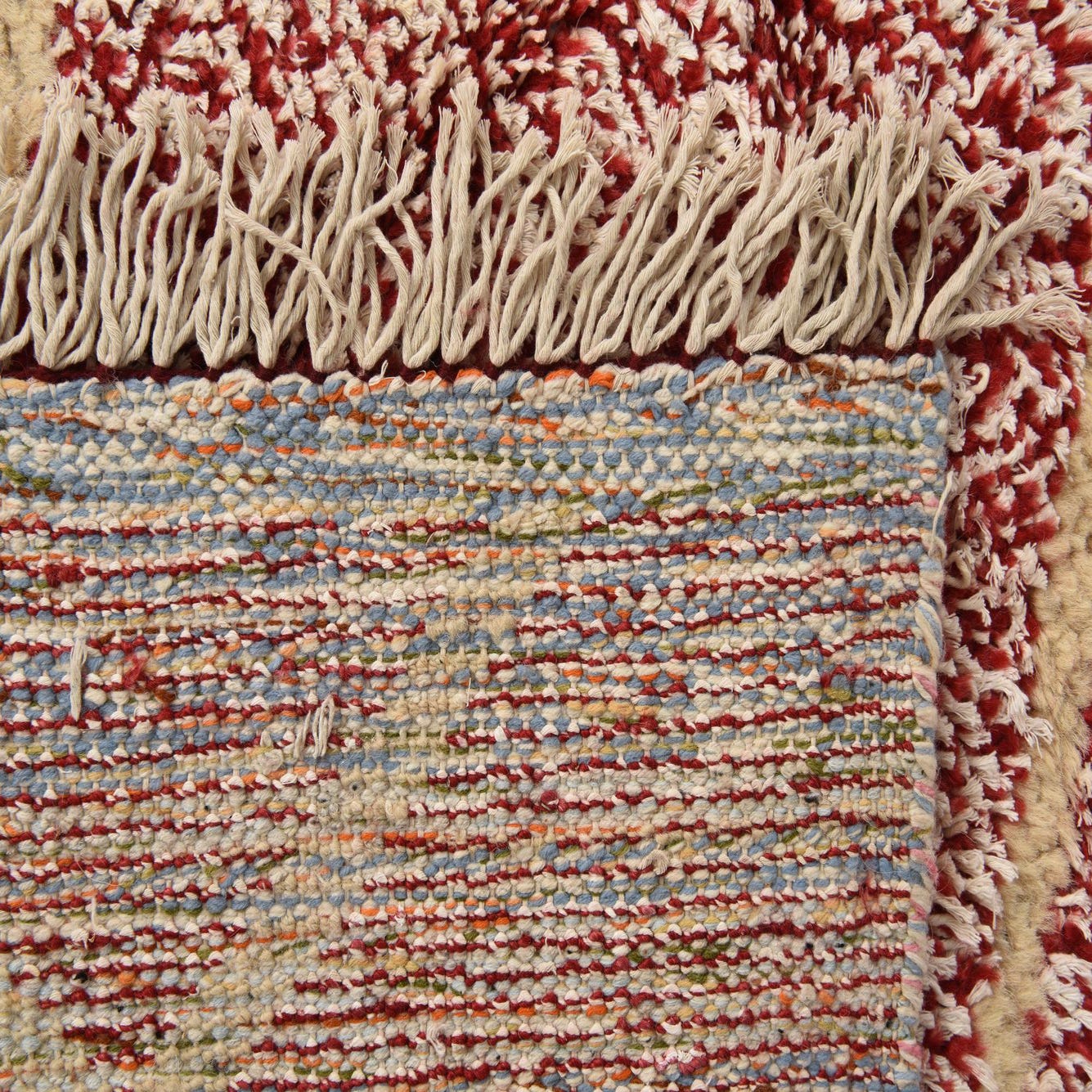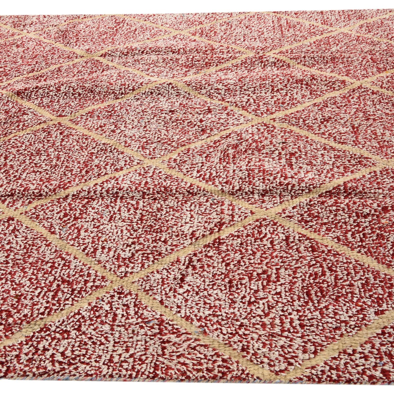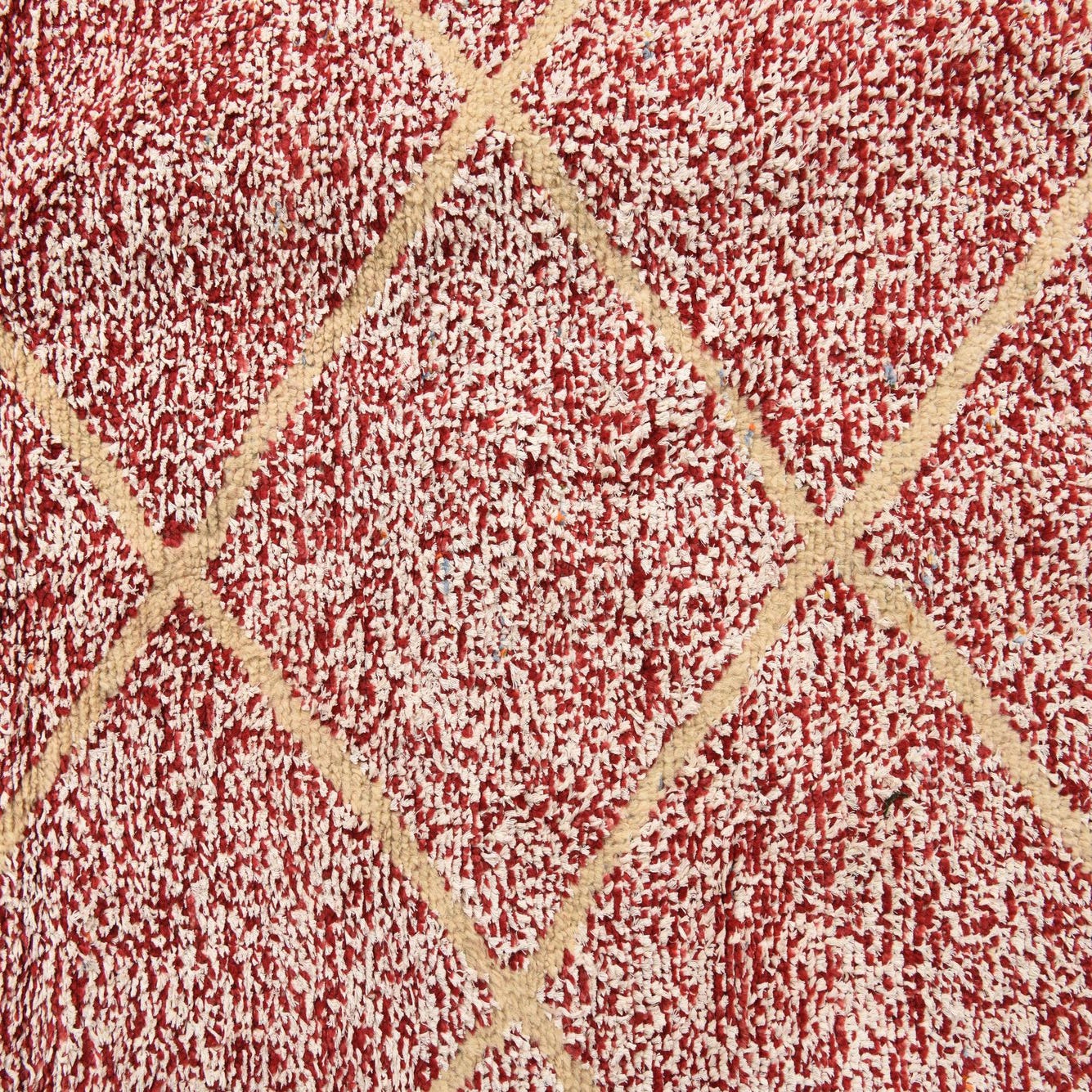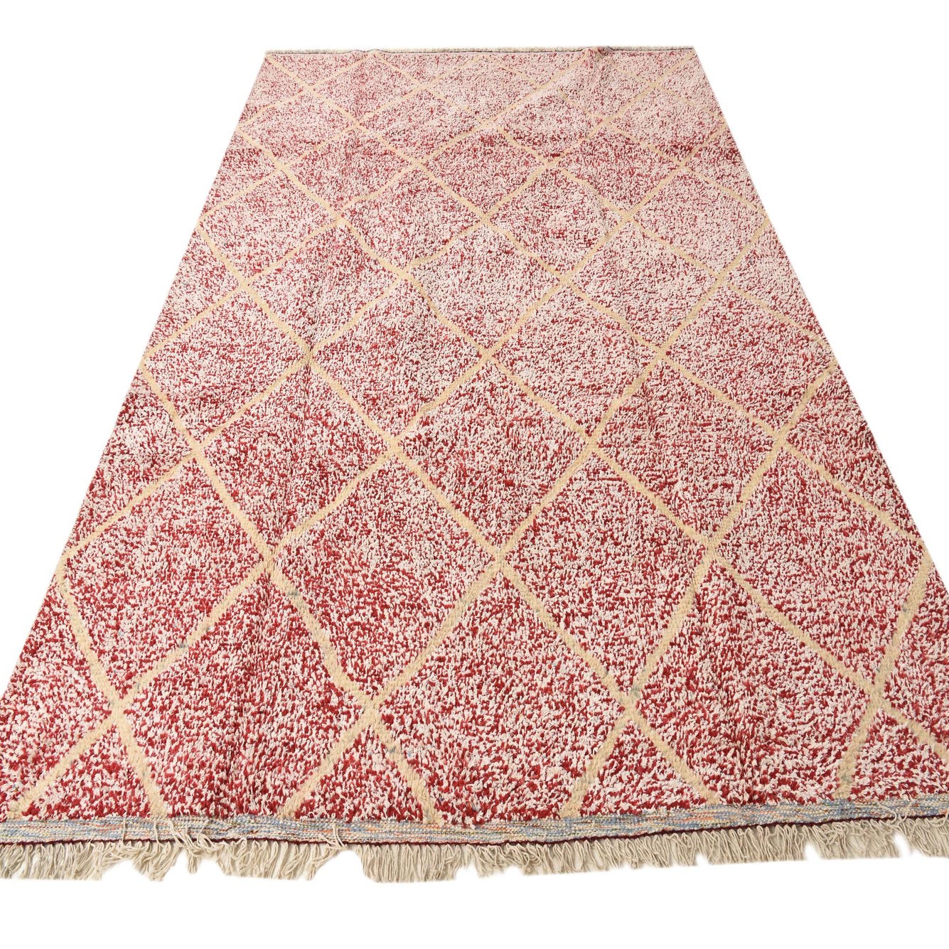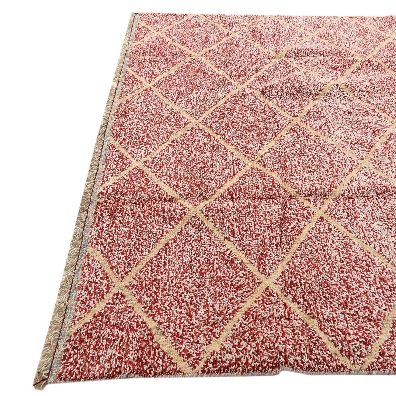 A rectangular 8x11 Moroccan shag rug in red and ivory, featuring a tribal diamond pattern, ideal for a living room.