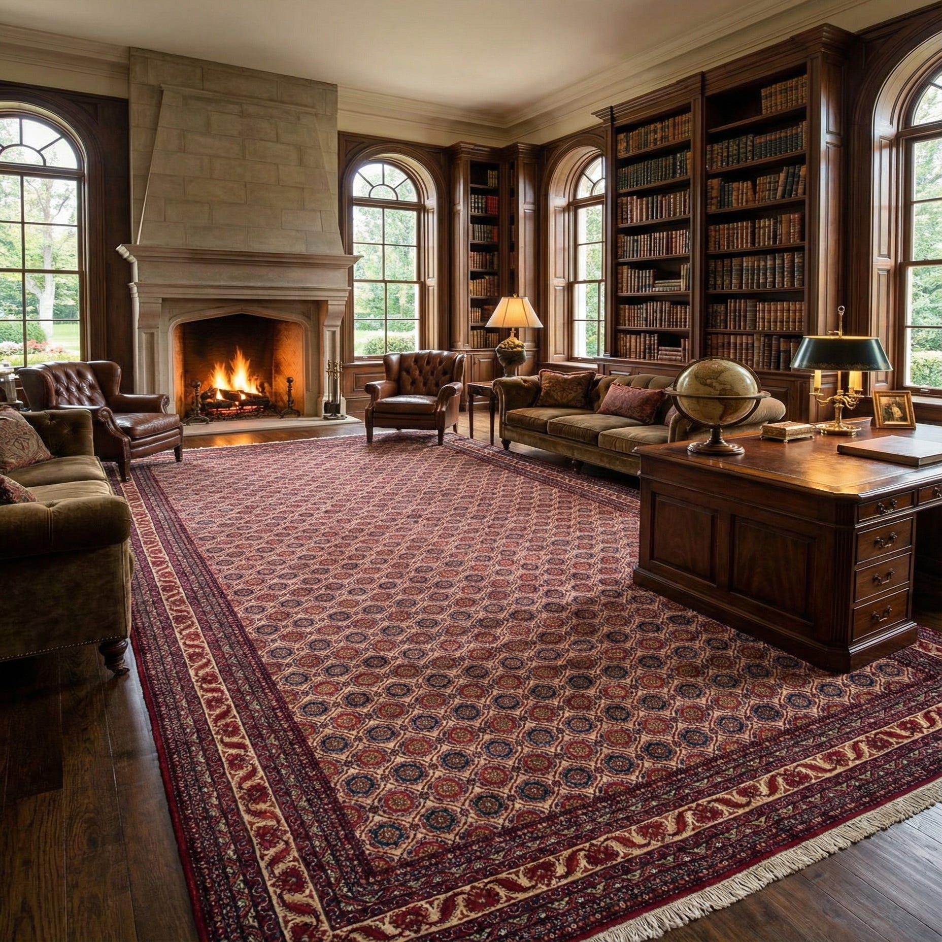 The rug's intricate geometric motifs and border designs exhibit a traditional aesthetic that complements both classic and transitional interiors. The rich color palette is ideal for spaces that seek to create a warm, inviting atmosphere and can act as a statement piece in a living room, dining area, or large foyer.