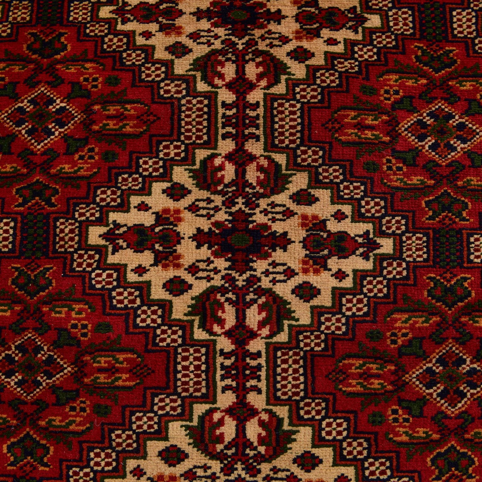 Primary color is Red. Colors in this rug include: Red, Black, Green, Ivory, Tan, Brown, Yellow.