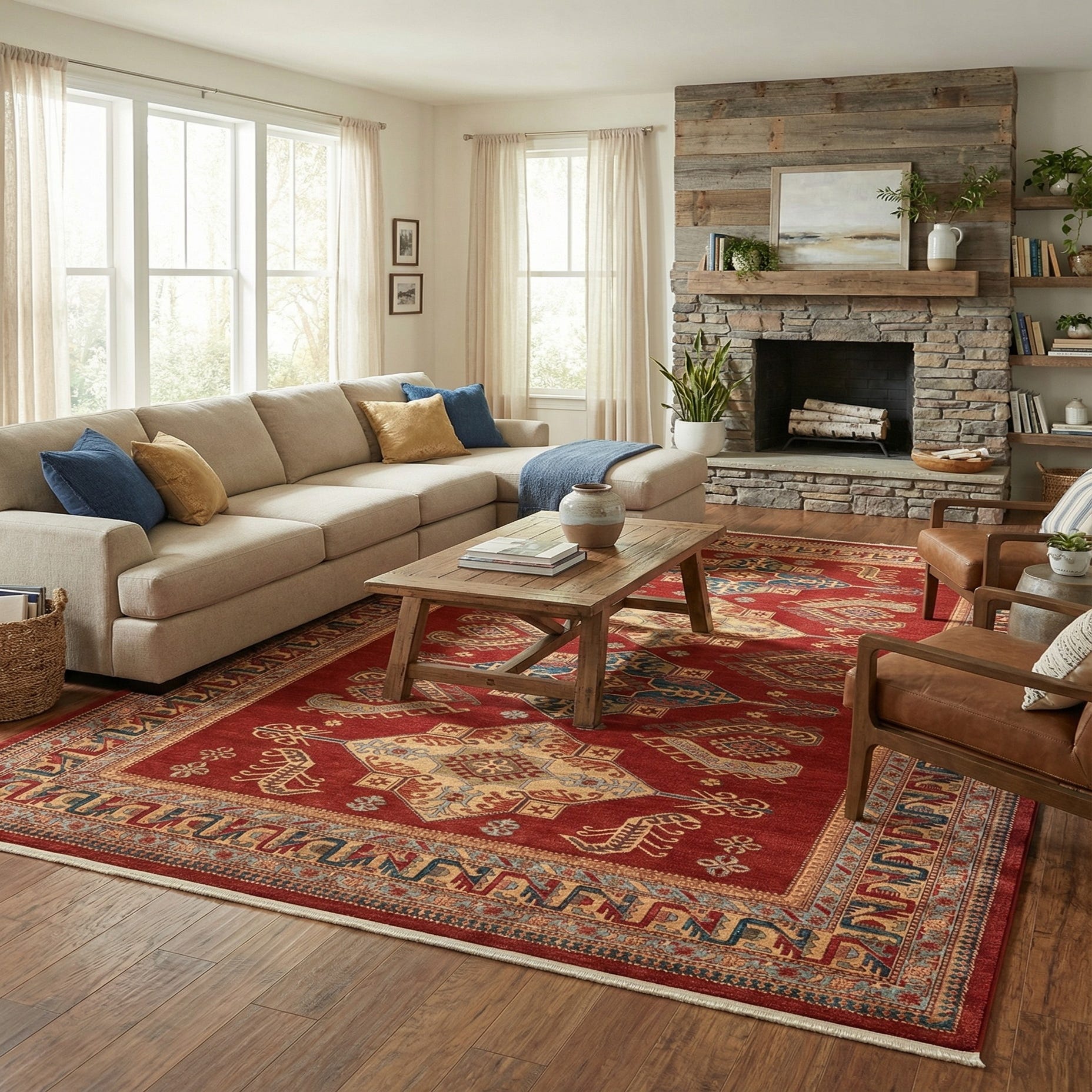 A rectangular red Southwestern palace rug with intricate tribal medallions and botanical patterns in blue, gold, and cream.