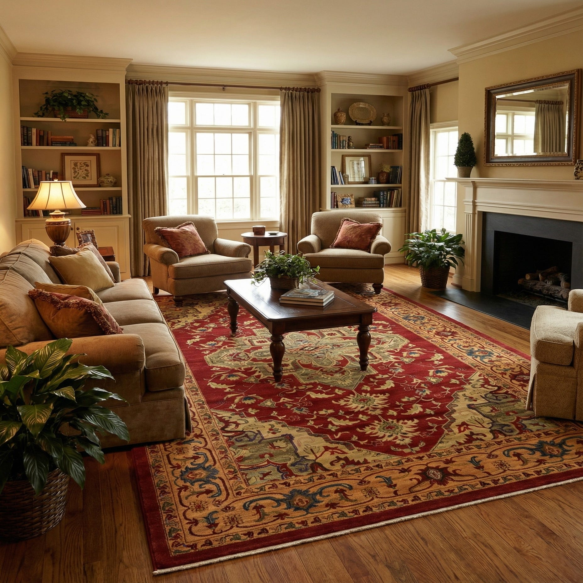 A large rectangular Sara Collection palace rug featuring a traditional medallion and botanical pattern in rich reds, gold, and blue.