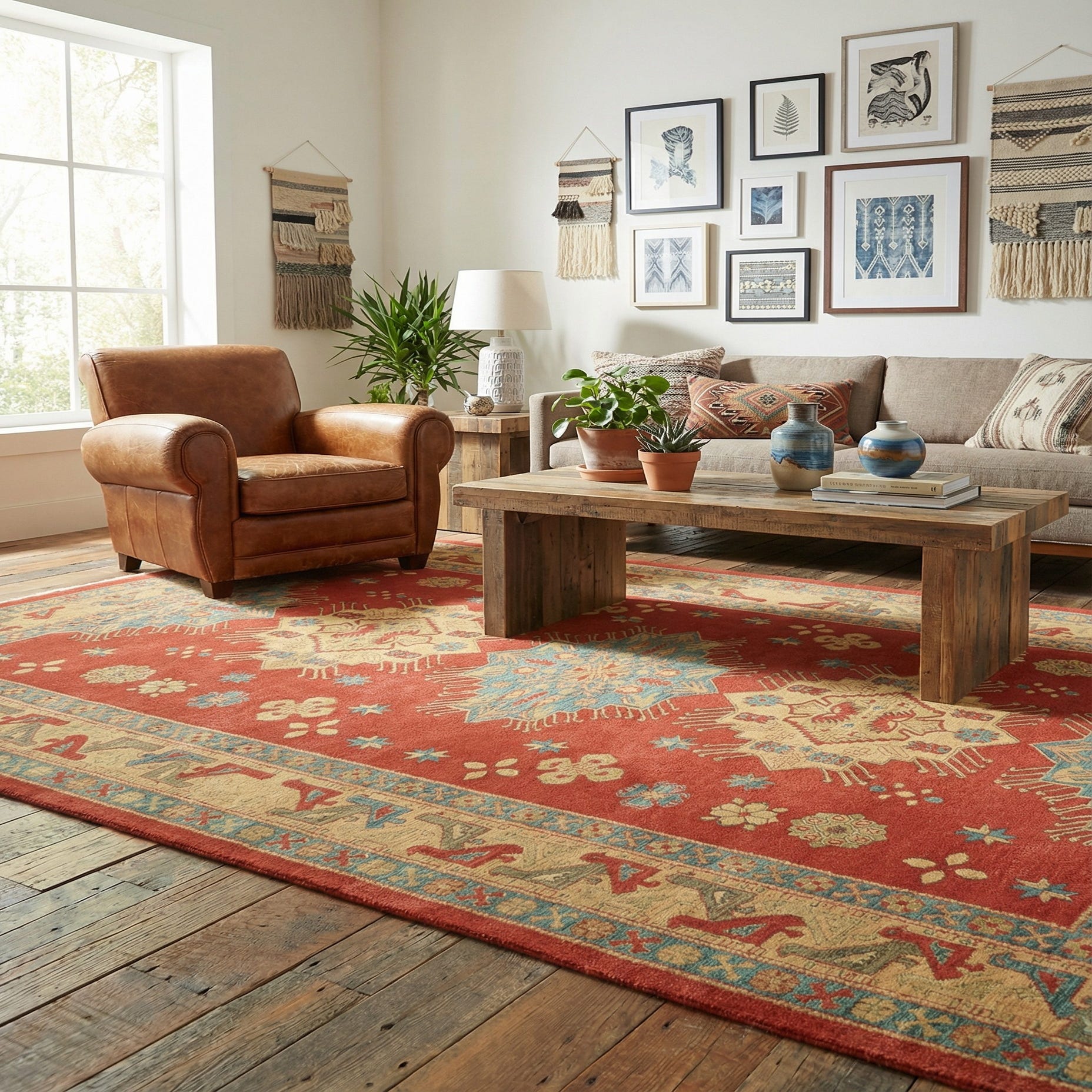 Machine-made from 100% polypropylene by Palace Rugs, the construction produces a low-pile surface that feels smooth and slightly cushioned underfoot while keeping the pattern crisp. The color palette—red background with cream and light-blue highlights—pairs neatly with warm wood tones, leather seating, or neutral upholstered pieces. Use this rug to anchor a living room seating group, define a formal dining area, or bring color and structure to a study or entry hall; it also layers well in transitional schemes where classic pattern meets contemporary furnishings.