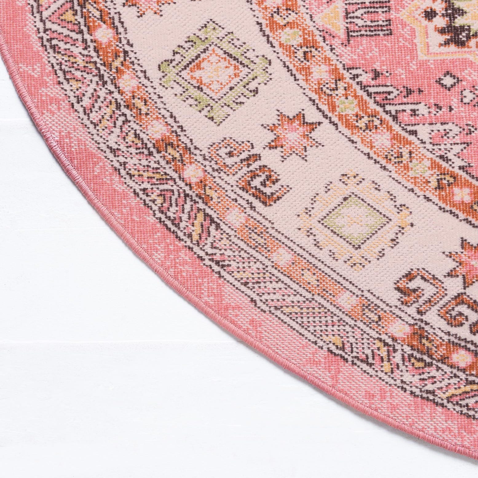 A round rug with a vintage-inspired geometric medallion pattern set on a warm rose field. Repeating hexagonal and star motifs in green, ivory, yellow, and terracotta create a layered, ethnic look with a soft faded effect, while an ivory outer band punctuated with small medallions and linear borders frames the design. Machine-made from 100% polypropylene, the rug has a low, even pile that feels smooth and slightly dense underhand, laying flat and offering a comfortable, grounded surface.