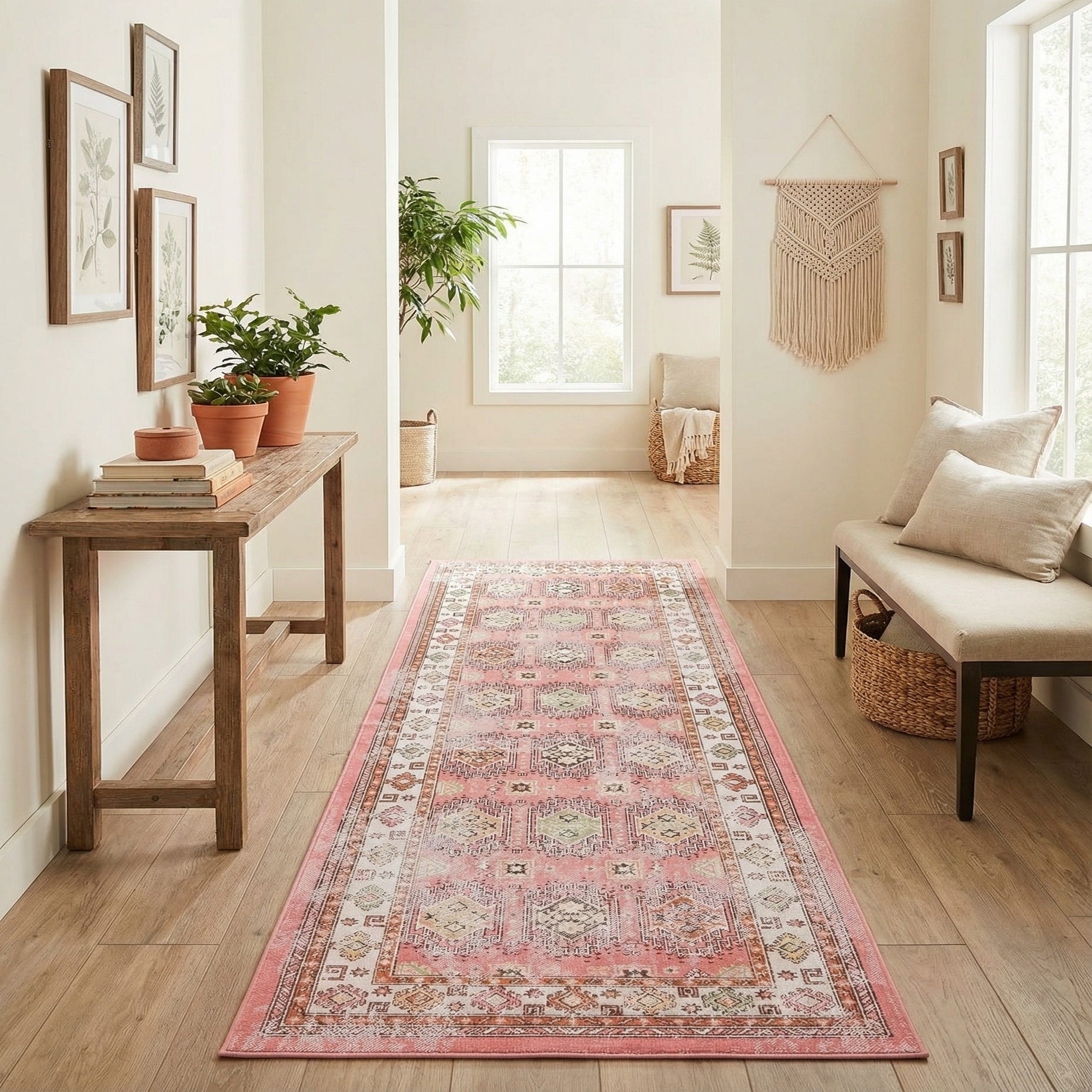 A 10 ft runner rug in shades of pink with a distressed Bohemian and Southwestern tribal pattern, featuring geometric motifs and a decorative border, perfect for a hallway.