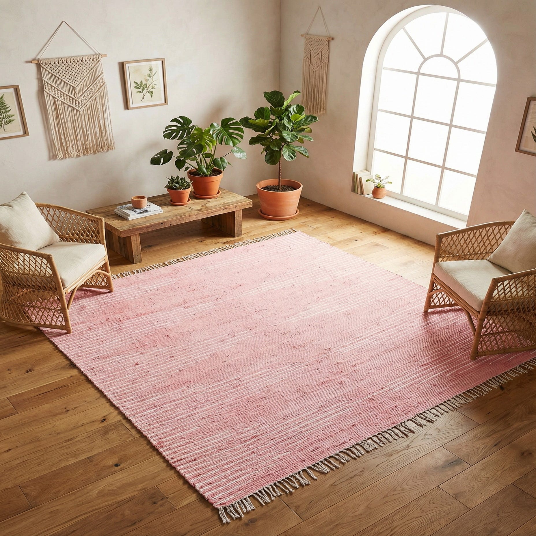 This rosy, striped piece works well in light, airy bedrooms or a nursery paired with ivory linens and natural wood accents, or layered over hardwood in a casual living room to soften the seating area. It also fits clean, minimalist spaces—Scandinavian or modern farmhouse schemes—where the gentle color brings warmth without dominating the palette, and pairs nicely with rattan, linen upholstery, and soft metallic accents for a lived-in, contemporary look.