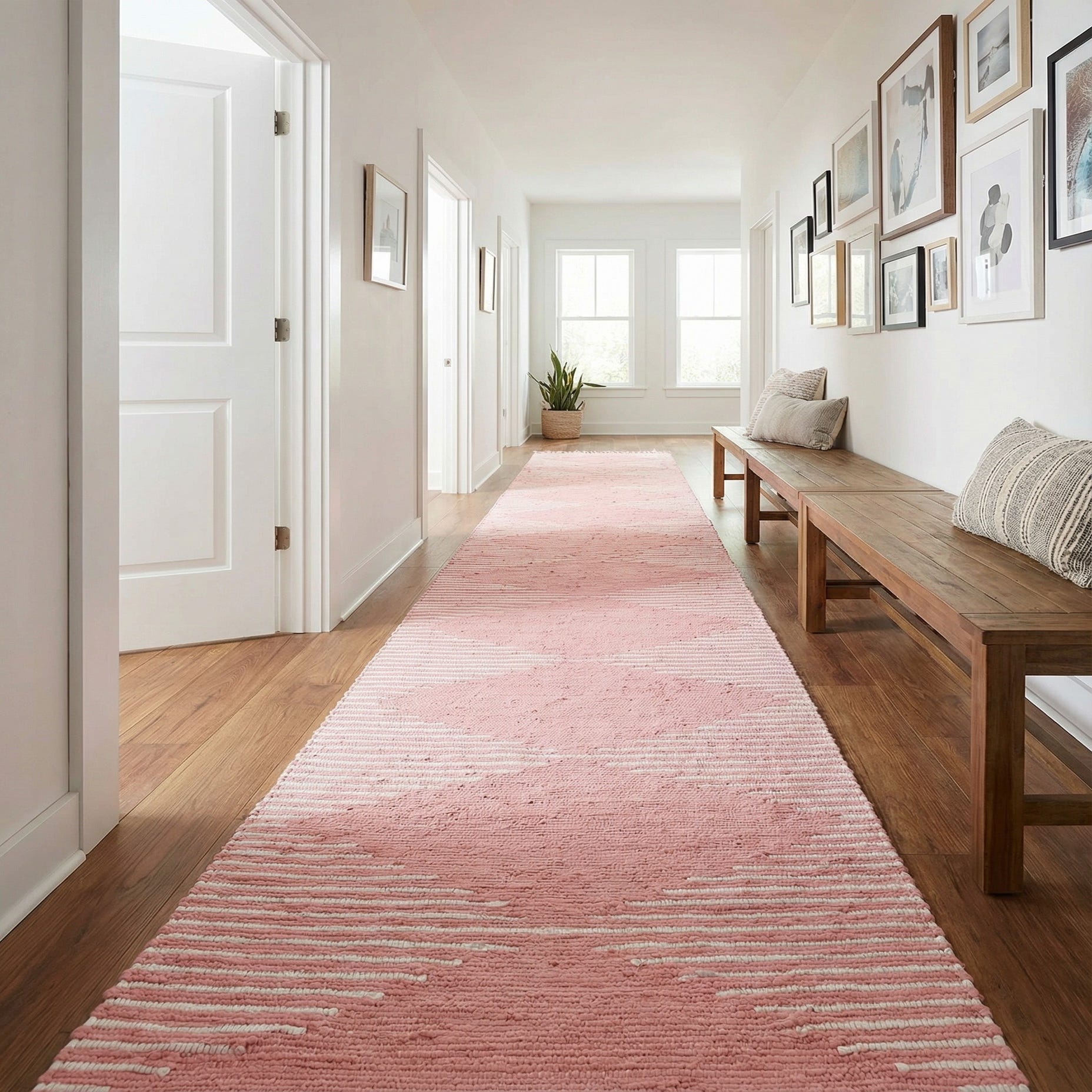 Use this runner to add color and pattern to a long hallway or entry, or place it down a kitchen galley to warm up white cabinetry and light wood floors. It pairs well with Scandinavian and modern farmhouse interiors, coastal cottages, or a softly layered look in a child’s bedroom—combine with rattan, linen, pale gray accents, or brass hardware to balance the rose and ivory tones.
