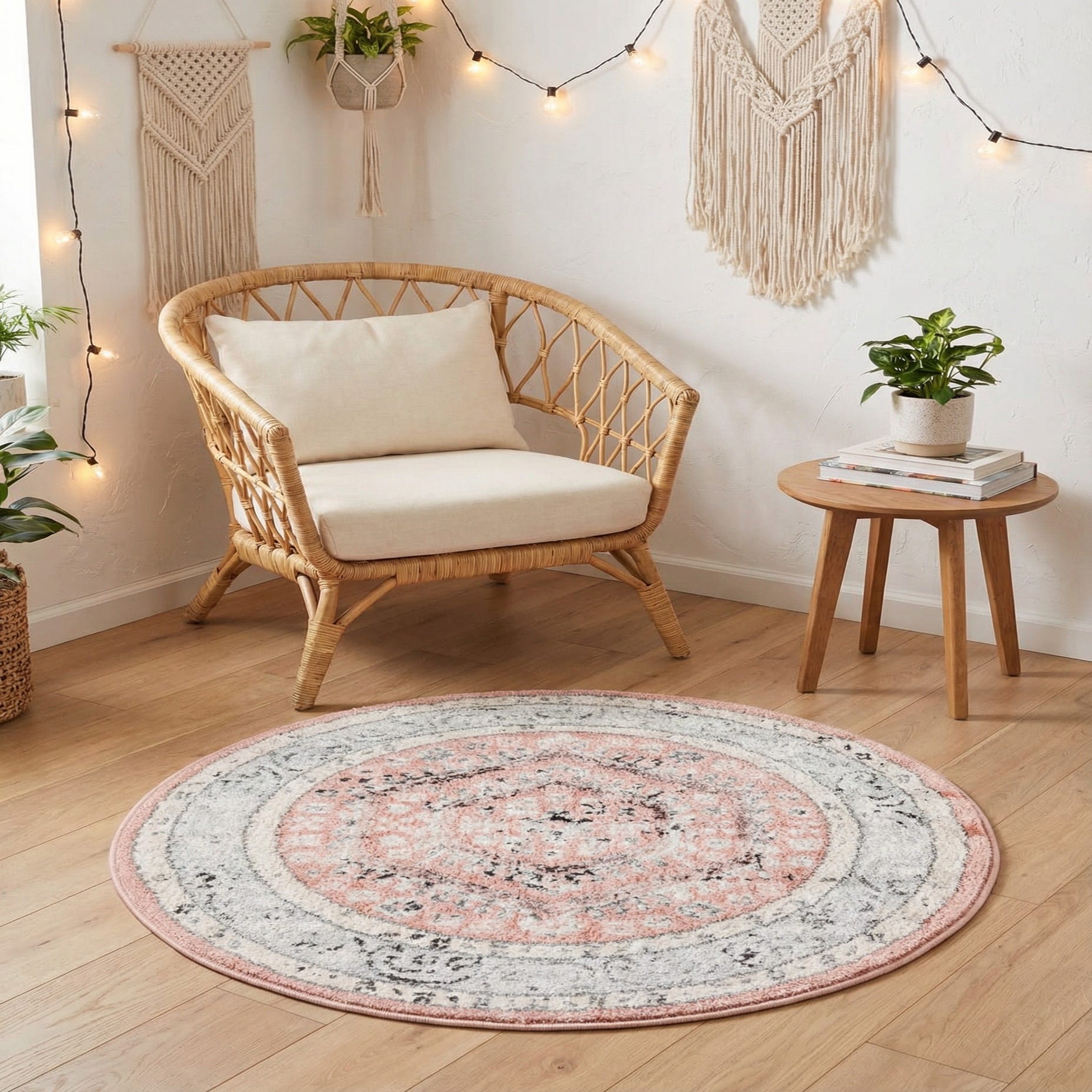 A soft rose field sets the stage for a vintage-inspired medallion motif that radiates from the center. Layers of ivory and gray form the ornate circular borders, while touches of black add definition and a gently distressed character. Machine-made from 100% polypropylene, the rug has a low-to-medium pile with a pleasant, slightly velvety hand and a subtle sheen that highlights the pattern without overpowering the palette.