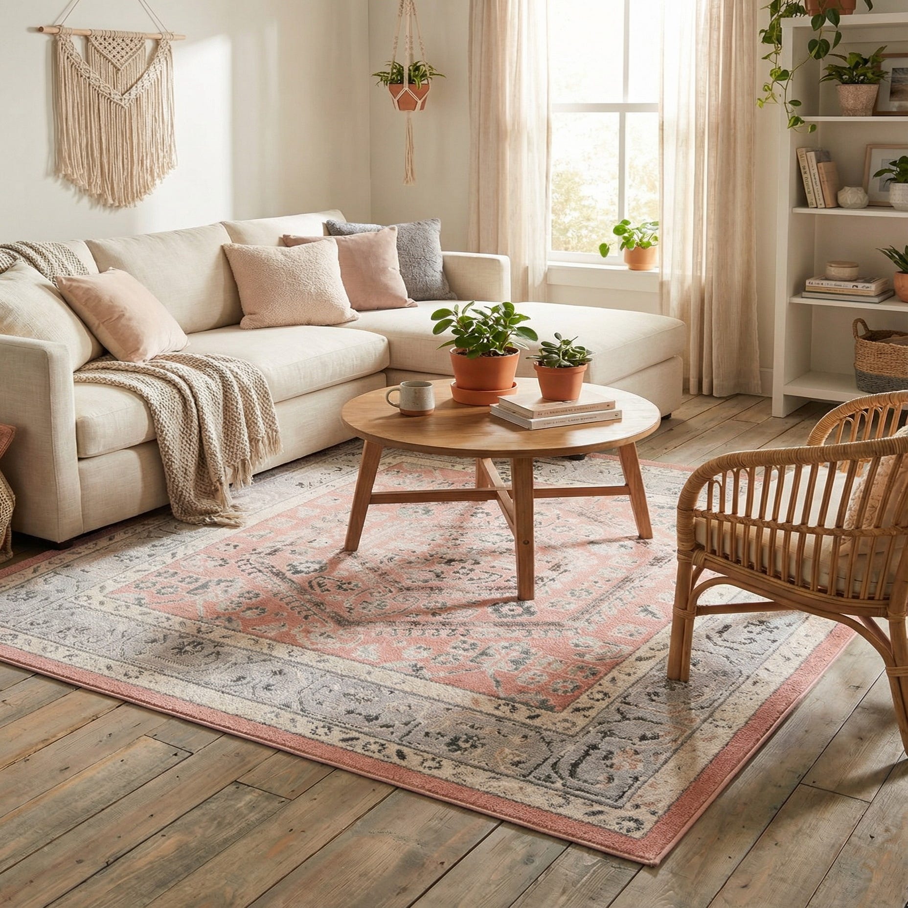 This piece works well as an anchor for a light, airy bedroom or a cozy living area where warm pastels meet neutral furnishings. Pair it with ivory linens, weathered wood, and brushed metal fixtures for a modern-farmhouse or cottage look, or layer it beneath a small seating group to add color and pattern to a home office or nursery. The balanced mix of rose, gray, ivory, and touches of black lets the rug coordinate easily with both contemporary and transitional decor.