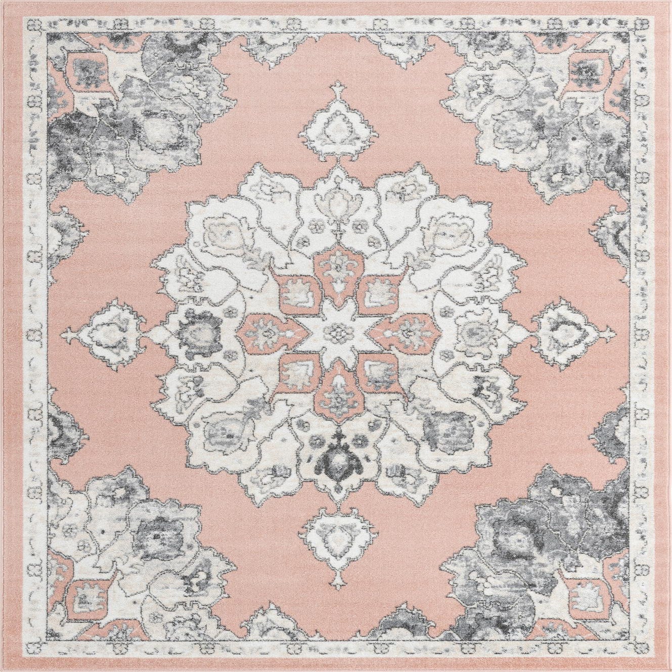 Primary color is Rose. Colors in this rug include: Rose, Black, Gray, Ivory.
