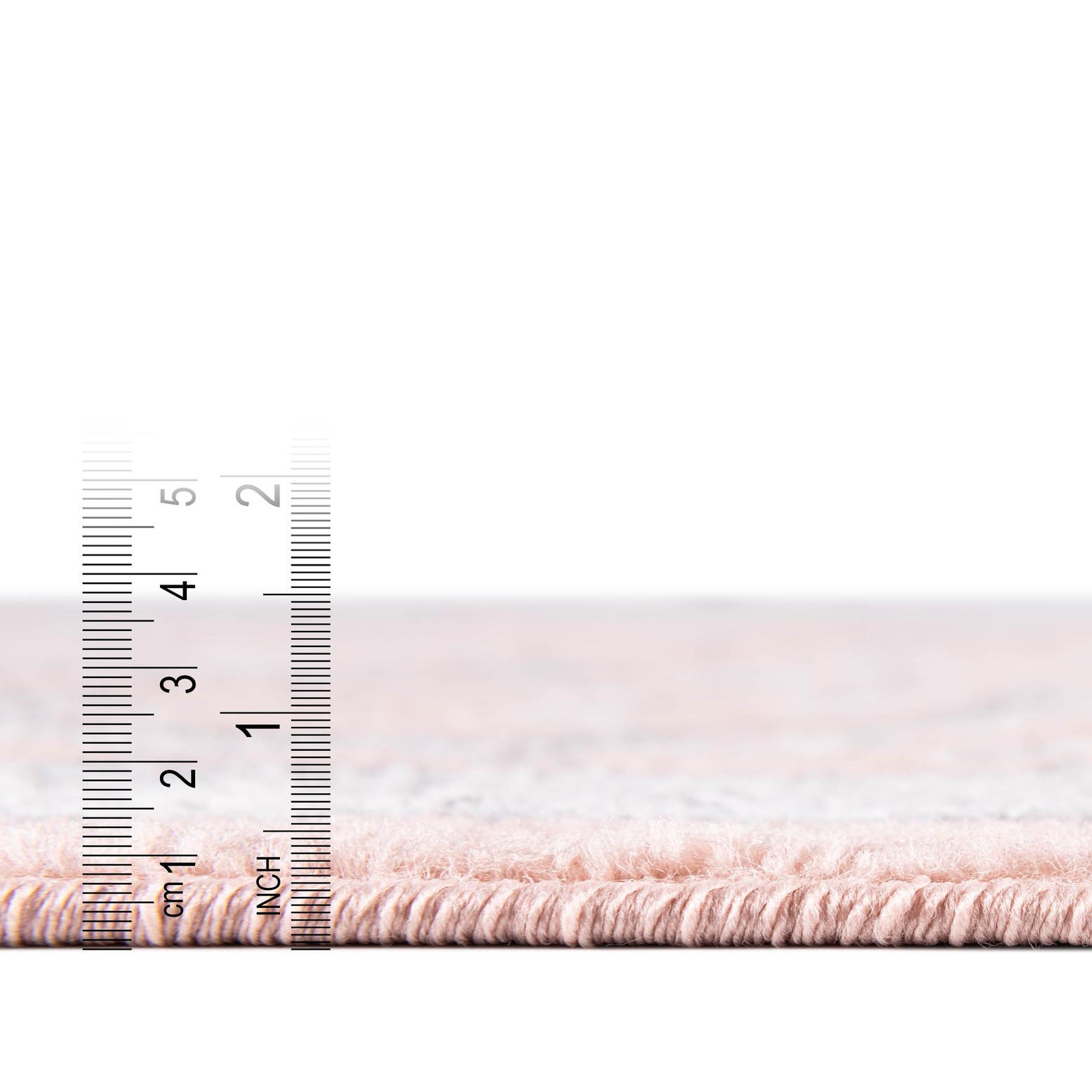 A soft rose field sets the tone for this octagonal rug, where a layered medallion design unfolds in ivory, gray and touches of black. The pattern pairs small floral motifs and geometric lines in concentric borders, with a gently distressed finish that gives the surface visual depth without heavy texture. Machine-made from 100% polypropylene, the rug has a low, even pile with a smooth hand and a subtle sheen that highlights the muted contrasts between the rose background and the cooler ivory and gray accents.