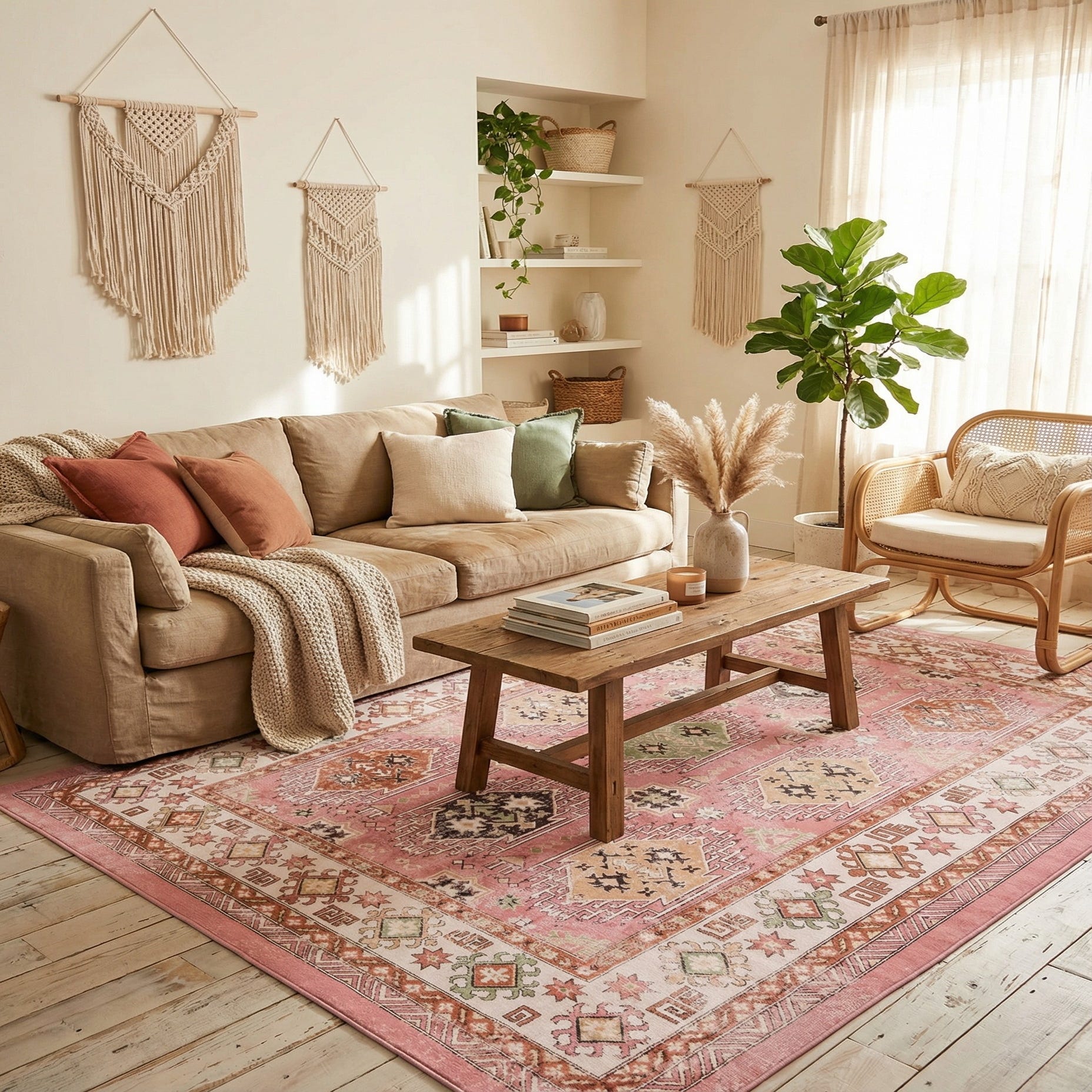 A 7x10 rectangular pink bohemian area rug with a vintage tribal pattern and a white border.
