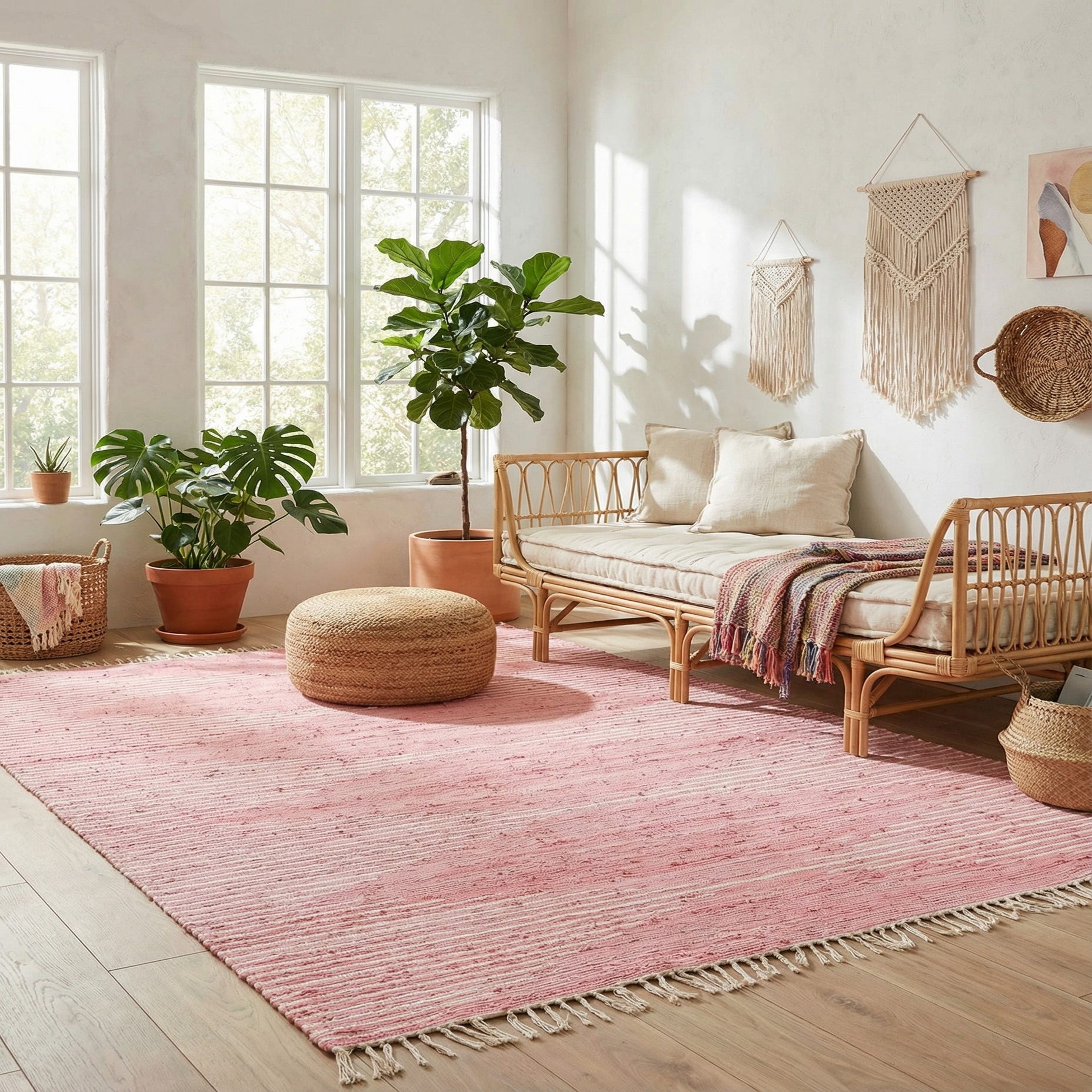 Hand-woven of 100% cotton, the rug has a flatweave texture that lies low to the floor and feels soft underfoot while offering a bit of tactile grain from the cotton slubs. Its understated pattern and color palette work well in relaxed, contemporary settings—pair it with light wood furniture and linen upholstery for a Scandinavian look, layer it into a boho living room with textured pillows and plants, or place it in a bedroom or nursery to introduce a gentle, feminine tone. It also lays nicely beneath a dining table or in an entry where a low-profile rug is preferred.