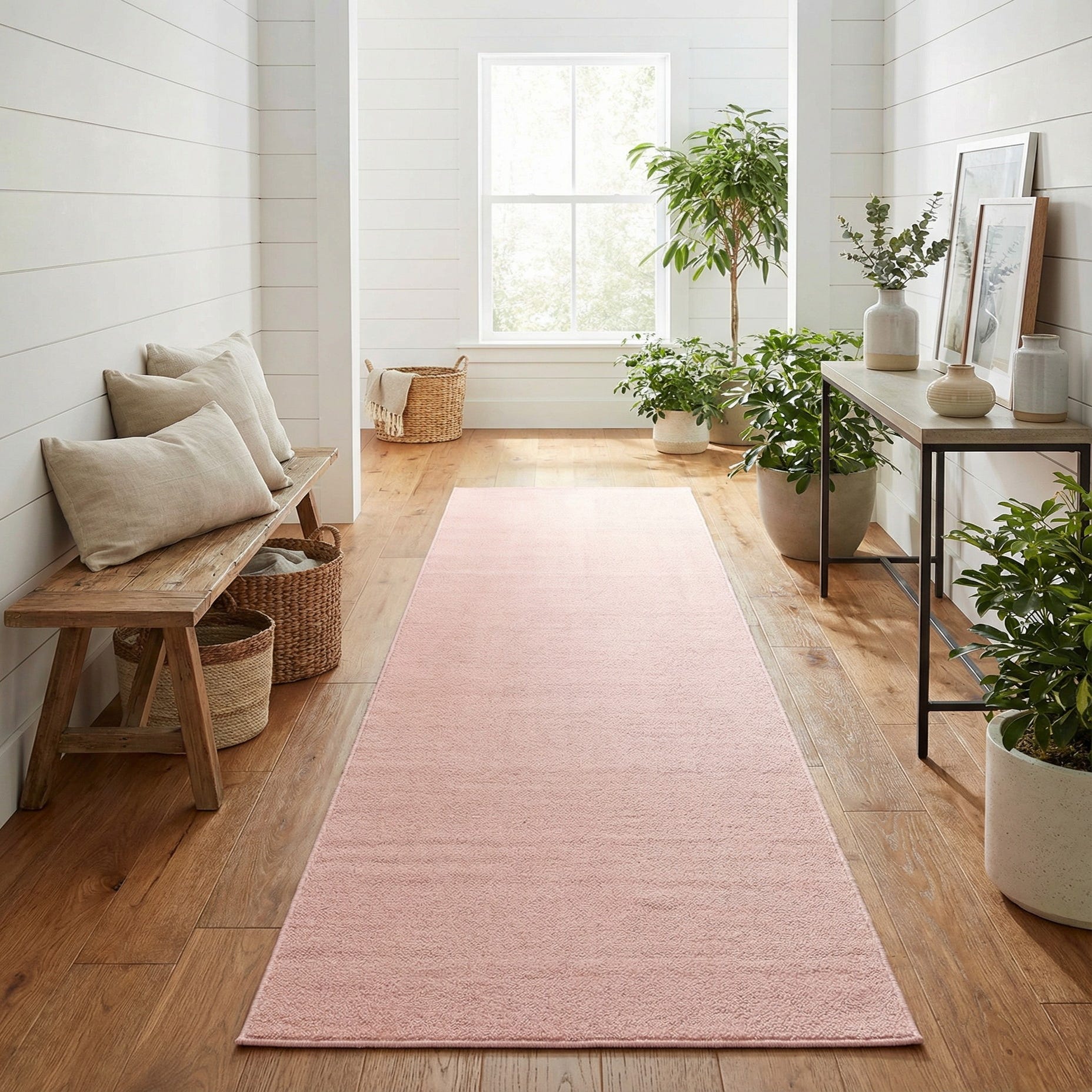 Soft rose pink covers this runner in a single, steady tone, creating a calm, modern foundation for any narrow space. The surface is a low-profile, velvety cut pile with a subtle sheen that catches light without patterning—clean and minimal in appearance. Machine-made of polypropylene, the construction yields a smooth, even texture that feels gentle underfoot and presents neat, finished edges.