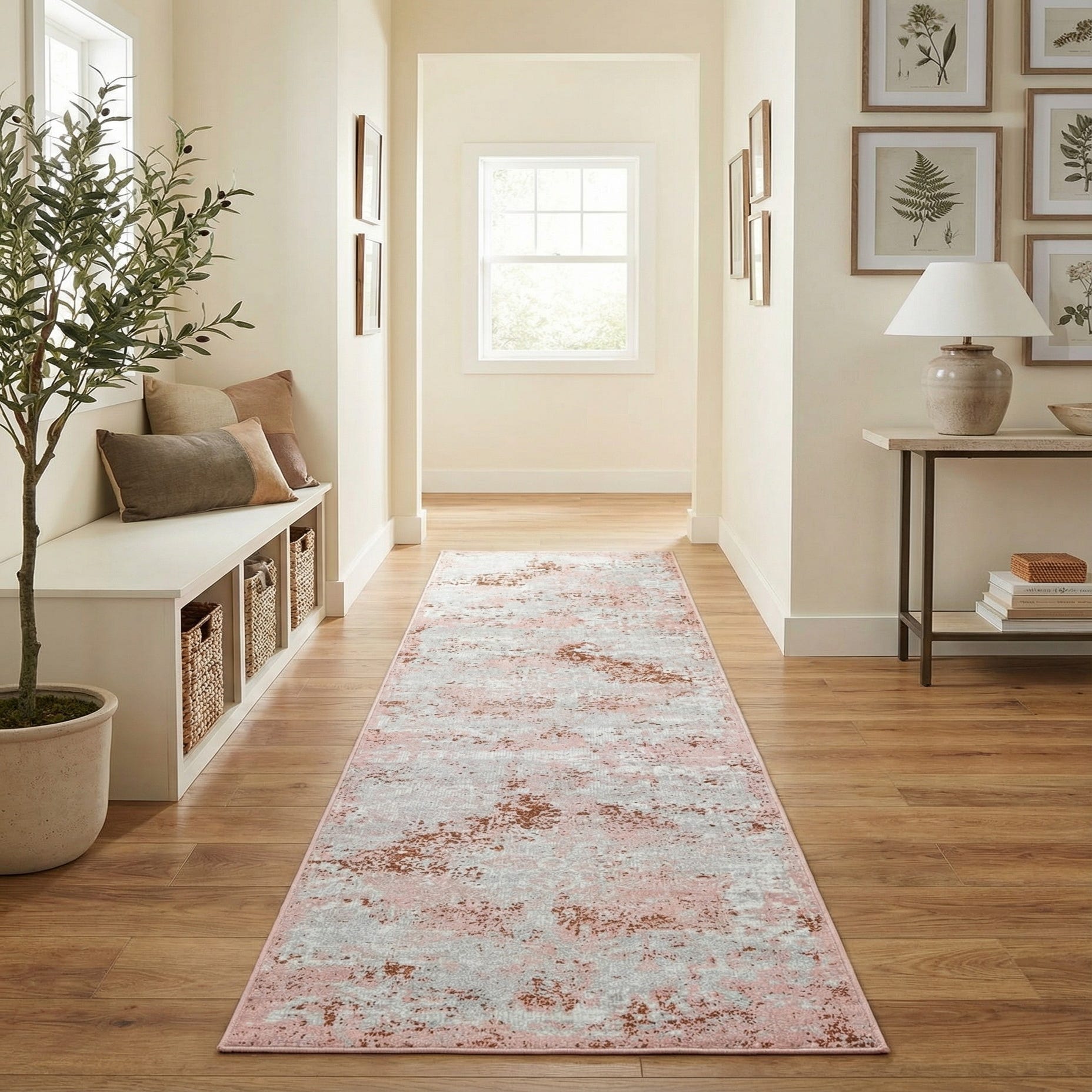 A 12 ft runner rug with a distressed pink, red, and white traditional medallion pattern, suitable for a hallway.