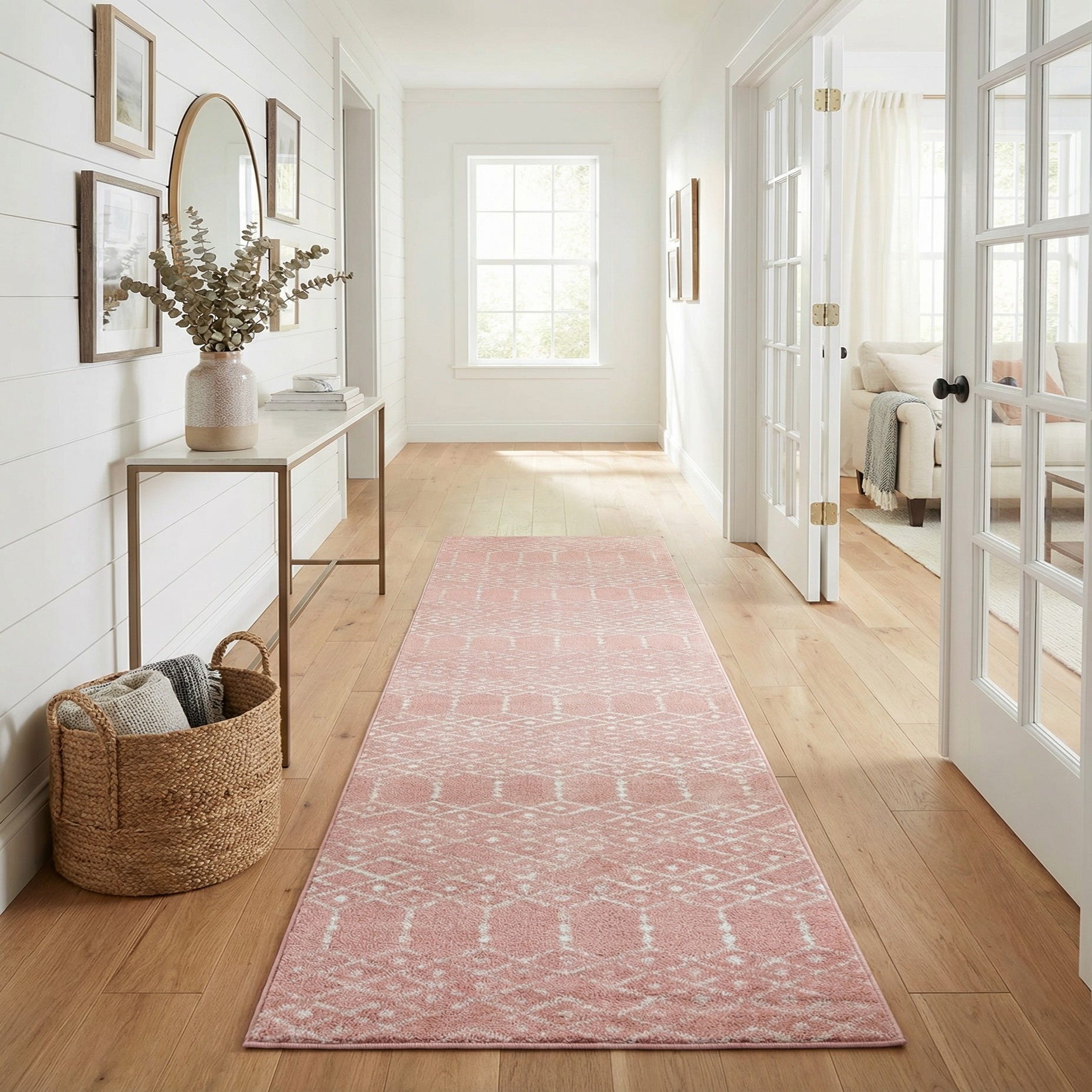 Use this runner to bring a warm, feminine touch to a hallway, entry, or alongside a bed, or to add color to a narrow kitchen or bathroom corridor. It pairs nicely with light wood tones, white or soft gray furnishings, and woven natural accents like rattan or linen; brass or matte black hardware can add a contemporary contrast. The color and pattern provide enough presence to anchor a space while remaining adaptable to both casual and more polished interiors.