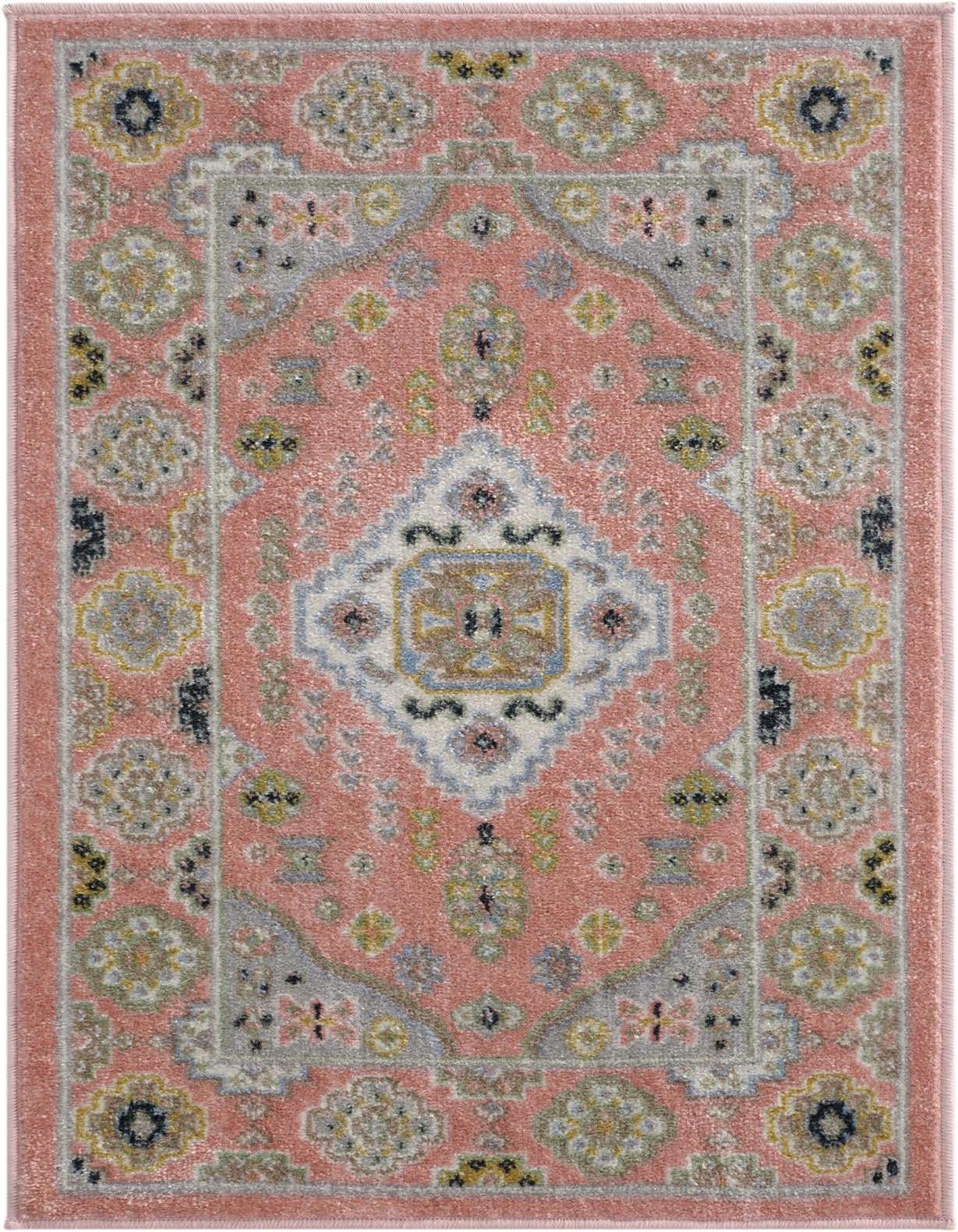 Primary color is Rose Pink. Colors in this rug include: Rose Pink, Black, Gray, Ivory, Green, Light Blue.
