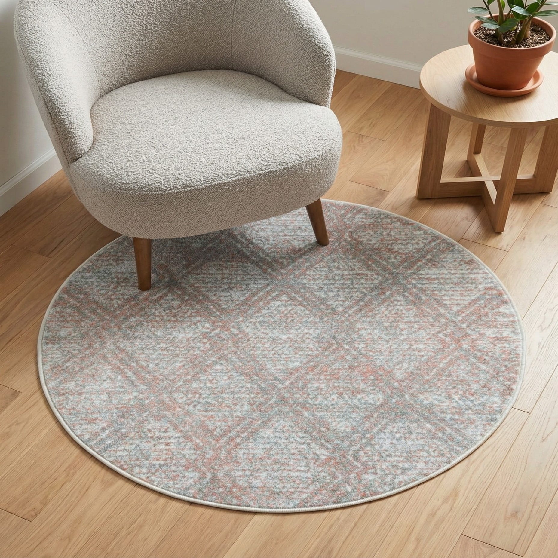The Kamala Washable Collection offers a versatile and charming 3 Ft Round rug that seamlessly blends practicality with style. Featuring a rose pink background, this rug presents a refined geometric pattern accented by hues of gray and ivory, creating a harmonious color palette suitable for a variety of spaces.