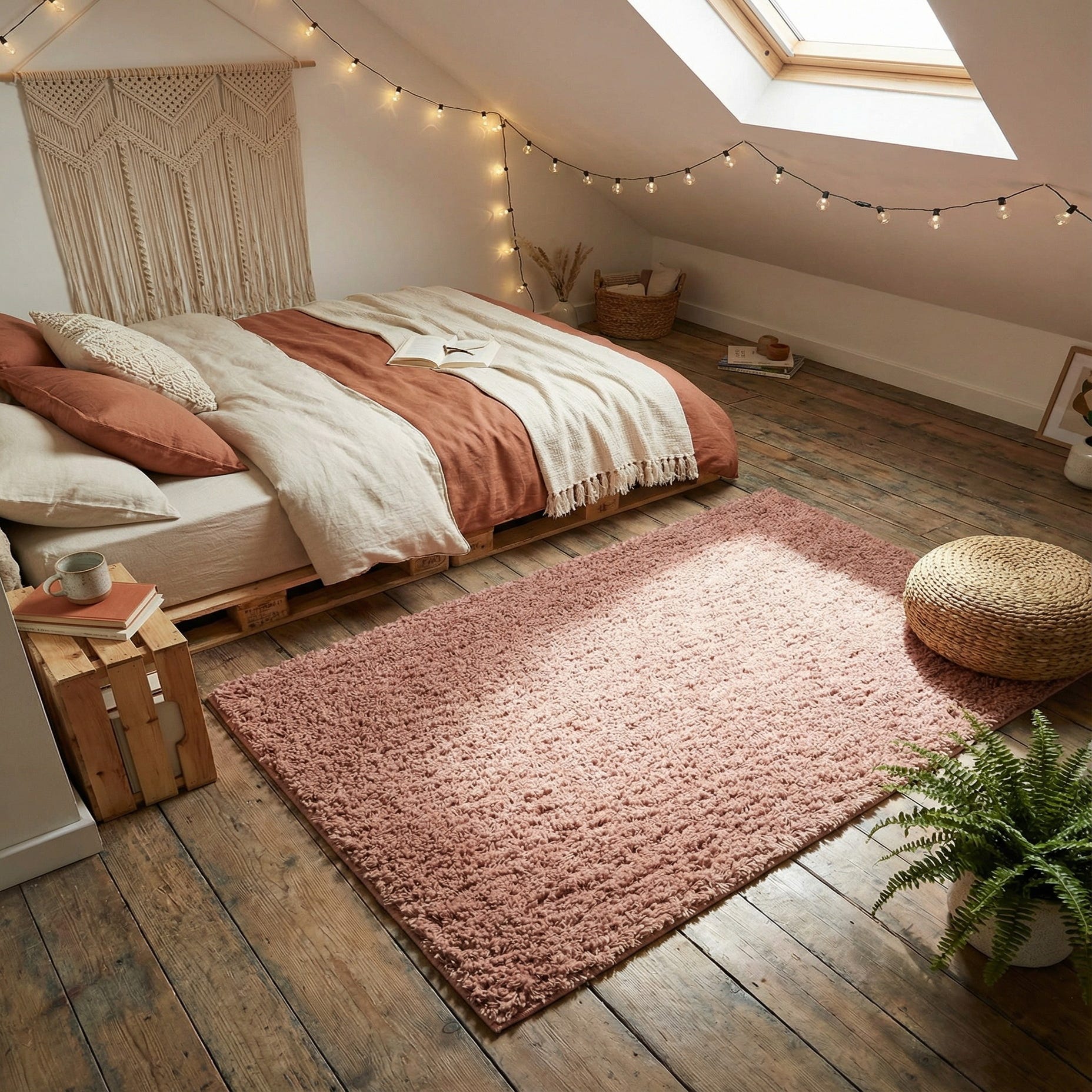 This rug works well in bedrooms and nurseries where a soft, tactile surface enhances comfort, or placed under a small seating arrangement or reading nook to introduce warmth and color. Pair it with creamy neutrals, warm grays, or richer jewel tones like navy and emerald for contrast; it also complements mid-century modern, Scandinavian, romantic modern, and bohemian interiors when layered with natural wood, brass accents, or textured throws and pillows.