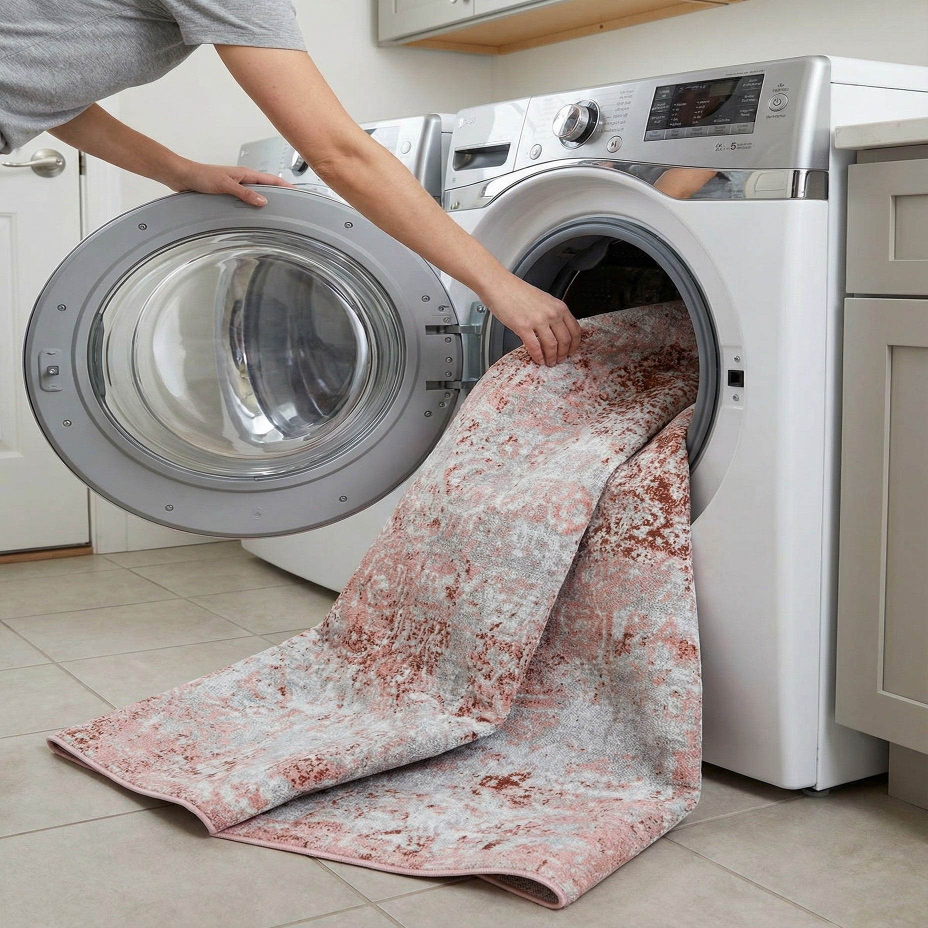 A 4x6 rectangular Kamala Washable rug featuring a distressed pink, red, and grey Oriental medallion pattern.