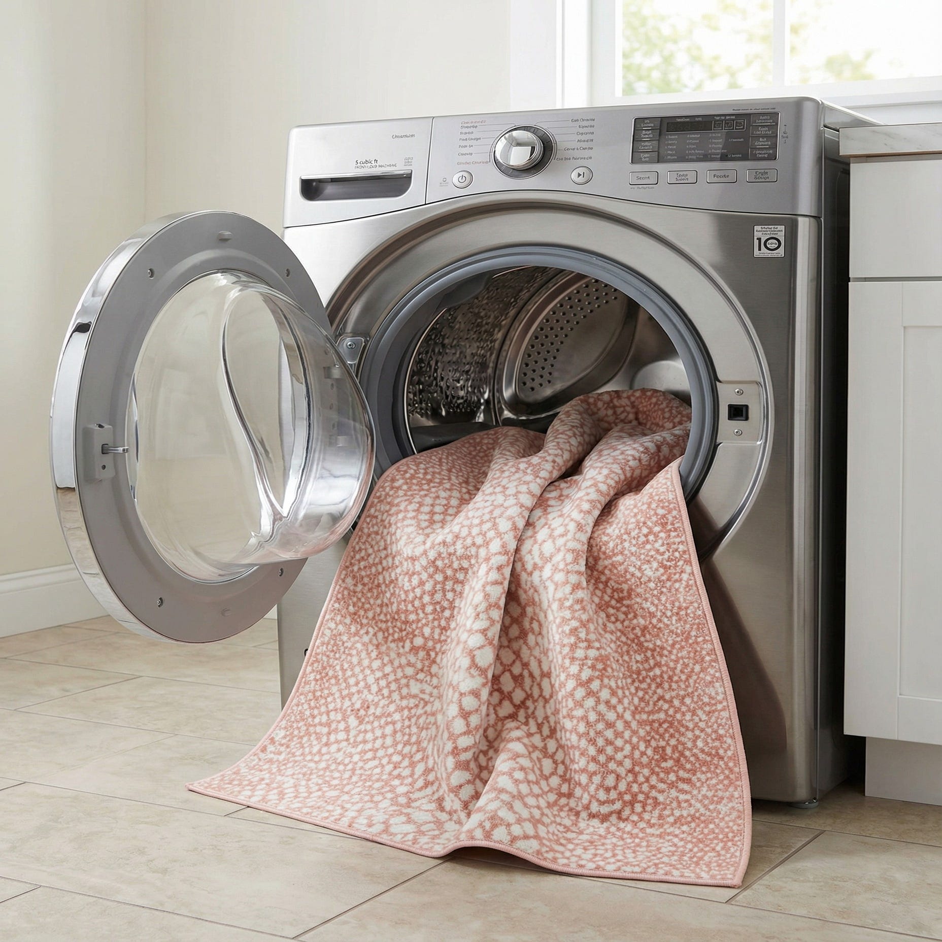 A soft rose pink field is patterned with an irregular ivory pebble motif that moves across the surface in an organic, allover layout. The design has a subtle, slightly broken-in appearance that gives the rug visual depth without feeling busy. Machine-made from 100% polyester, the low-profile pile feels smooth and pleasantly soft underfoot; running your hand over the surface reveals gentle texture where the ivory motifs contrast with the rose background.