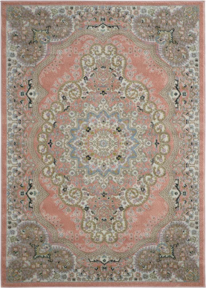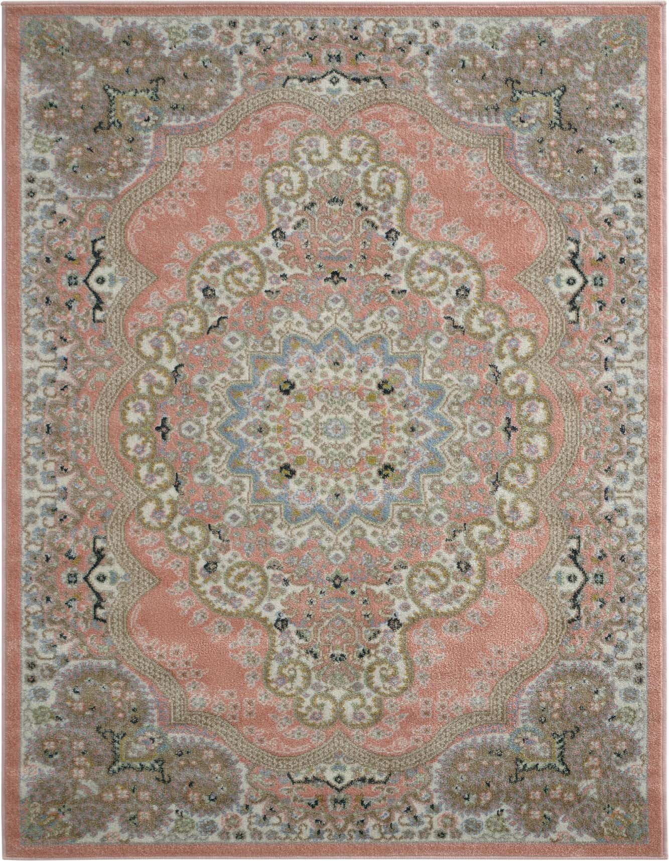 Primary color is Rose Pink. Colors in this rug include: Rose Pink, Beige, Ivory, Light Blue.